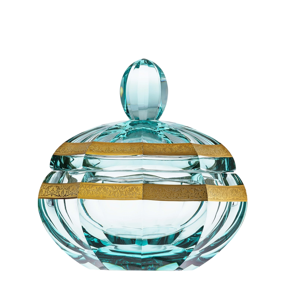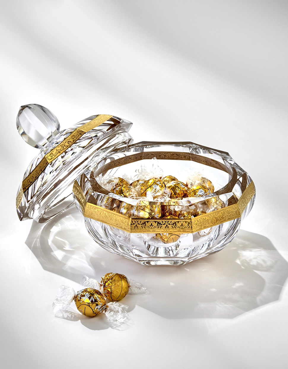 Boîte magique en authentique cristal de bohême taillé, ornée d’un élégant bandeau en or 24 carats avec des motifs floraux. Création de Moser, la plus prestigieuse & réputée cristallerie de Bohême.