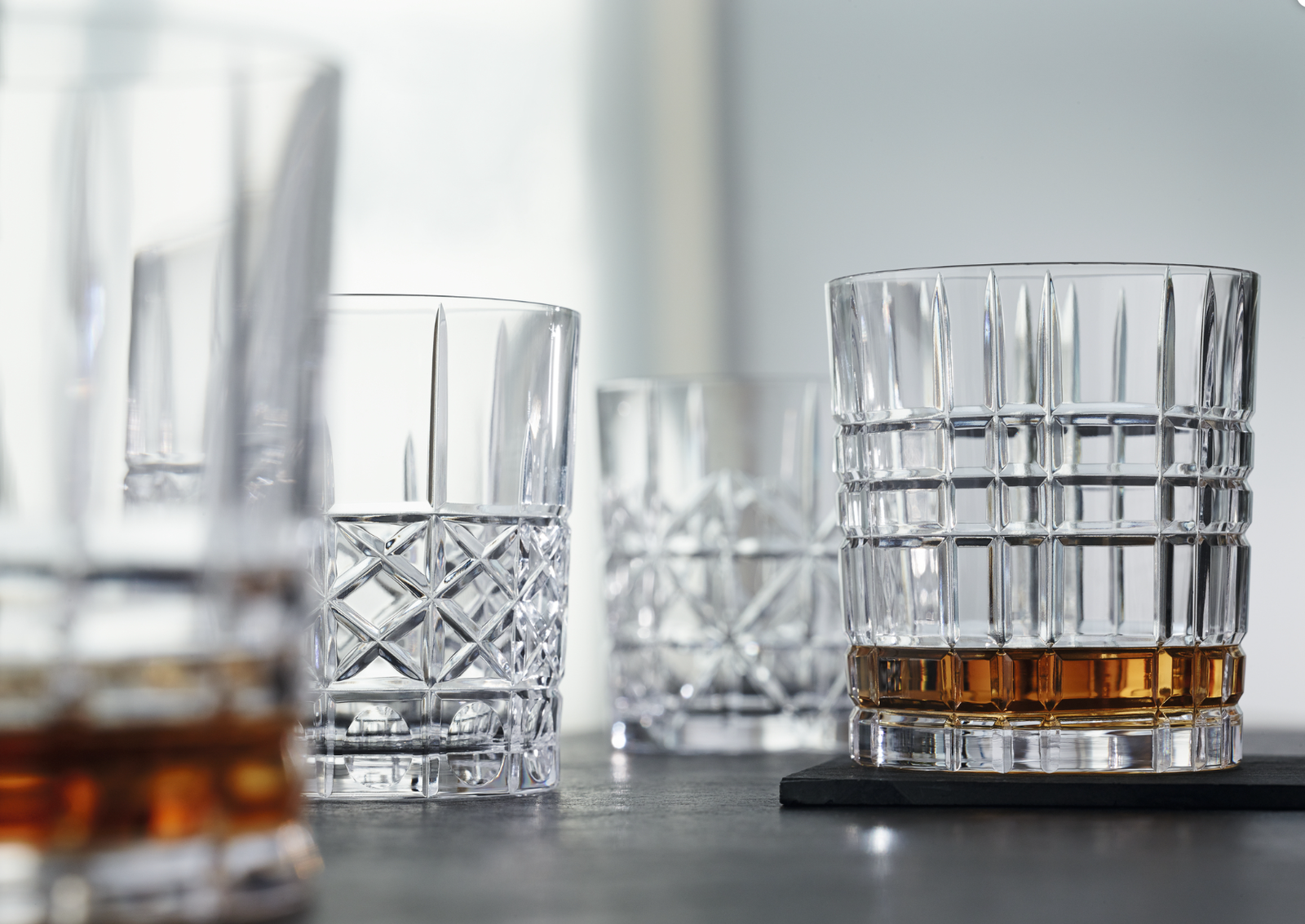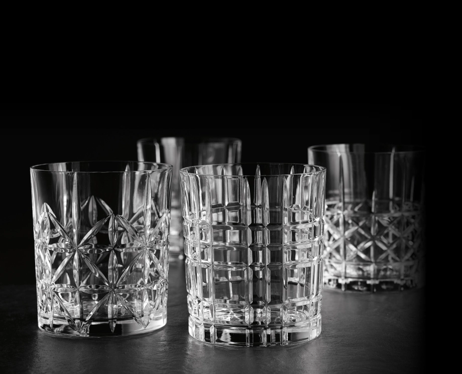 Verres à whisky en cristallin de la Maison bavaroise Nachtmann, collection Highland (collection dédiée à la culture du bar). Idéal pour ajouter une touche de luxe et d’éclat à votre dégustation de whisky, grâce aux 4 formes taillées.