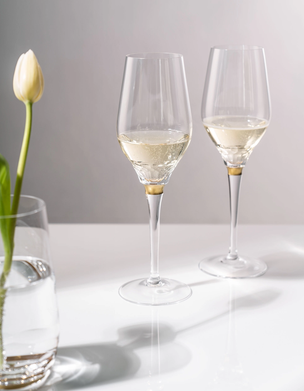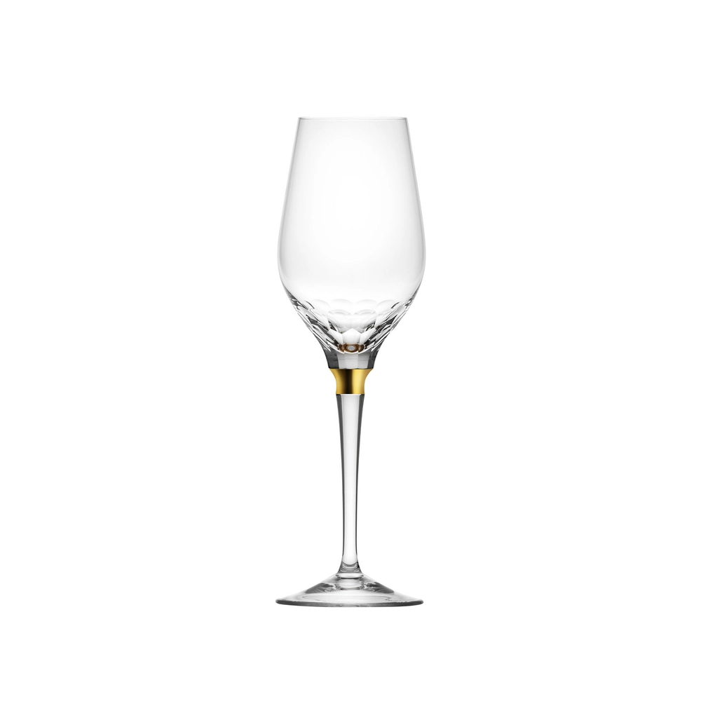 Verre à prosecco en authentique cristal de bohême taillé, avec une bague en or 24 carats. Création de Moser, la plus prestigieuse & réputée cristallerie de Bohême. Collection Jewel.