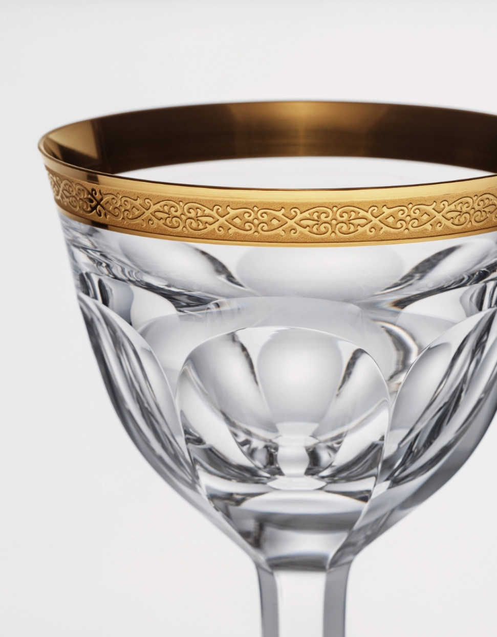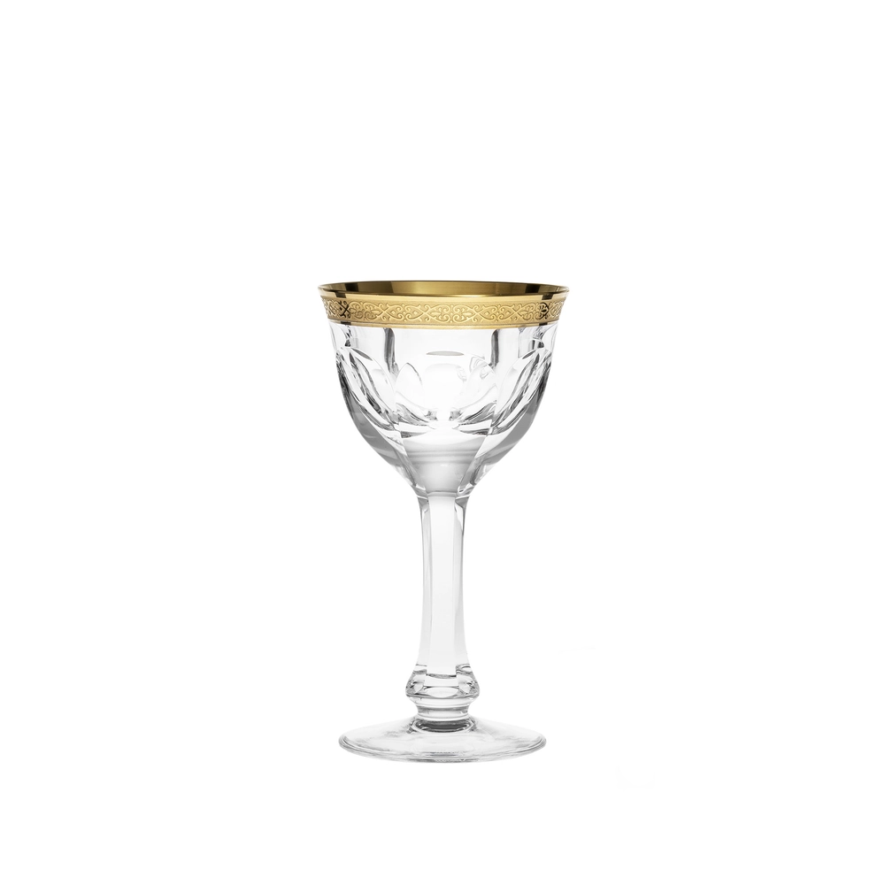 Verre à sherry en authentique cristal de bohême taillé, habillé d’une élégante bande en or 24 carats. Collection Lady Hamilton (inspirée d’Emma Hamilton) de Moser, la plus prestigieuse & réputée cristallerie de Bohême.