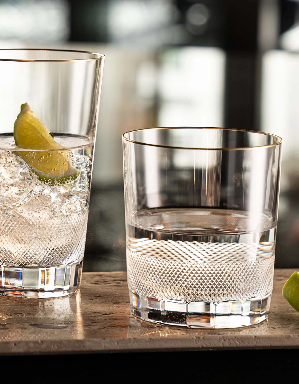 Collection en cristal de bohême taillé créée sur-mesure en 1907 pour l’épouse du roi anglais Édouard VII. Depuis, elle n’a cessé de séduire la haute société en devenant populaire auprès de personnalités telles que le roi Haakon VII de Norvège, le sultan Abdul Hamid de Turquie ou le maharaja de Baroda. Cette collection était également utilisée dans les ambassades tchécoslovaques, ainsi qu’au siège des Nations unies à New York. Et pour cause, la perfection des formes classiques et la subtilité de la décoration, obtenues grâce à une coupe précise et à une quantité minimale d’or, confèrent à ce service un caractère sûr et solide. Son aspect austère s’inscrit dans l’esthétique néo-empire qui gagnait en popularité au début du siècle, au détriment de l’ornementation Art nouveau. Tandis que l’élégante bande en or 24 carats qui borde délicatement les bords des verres rappelle ses origines royales.