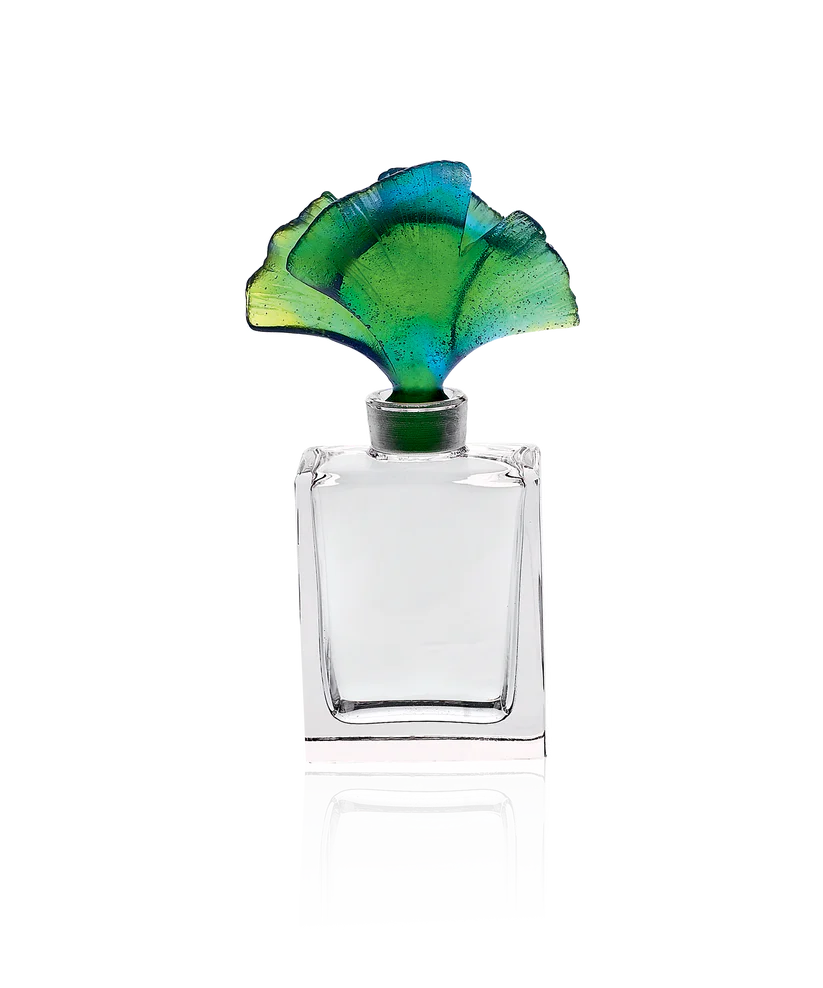 Ce flacon de parfum Daum, issu de la collection Ginkgo et évoquant la beauté sereine de l’arbre Ginkgo, est un hommage à la nature. Façonné en pâte de verre, technique séculaire maîtrisée par Daum, ce flacon représente une feuille de Ginkgo délicatement façonnée en pâte de verre, avec des nuances de bleu & de vert qui capturent la lumière et la reflètent avec grâce. L’élégance de ce flacon est rehaussée par le savoir-faire séculaire de Daum, qui transforme le cristal en une œuvre d’art vivante. Ce flacon de parfum est plus qu’un simple récipient, c’est une invitation à la contemplation, une célébration de la beauté naturelle qui apporte une touche de raffinement à tout espace. Création unique de la prestigieuse cristallerie Daum.
