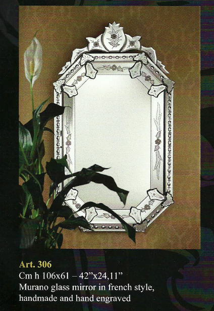 Véritable miroir vénitien au style français, entièrement réalisé & gravé à la main par des artisans vénitiens sur un miroir cristal à +30% de plomb.