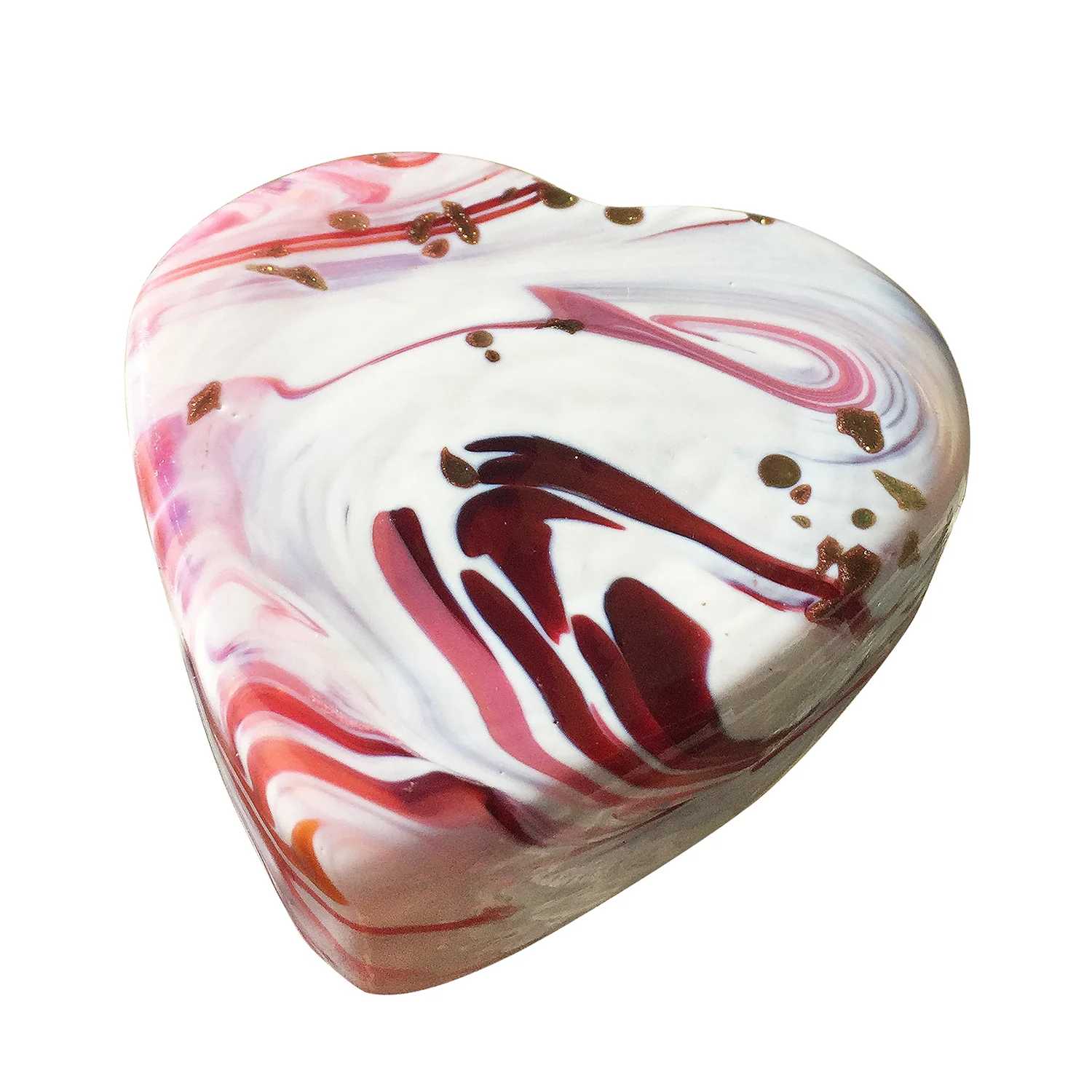 Presse-papier La Rochère, collection Cœur, mêlant un fond blanc veiné de framboise/grenat, et des grains effet cuivré-pailleté. Presse-papier en cristallin soufflé-bouche et fait main en France par les maîtres verriers La Rochère selon les techniques artisanales ancestrales. Pièce de la cristallerie La Rochère, l’une des plus anciennes cristalleries françaises, fondée en 1475.