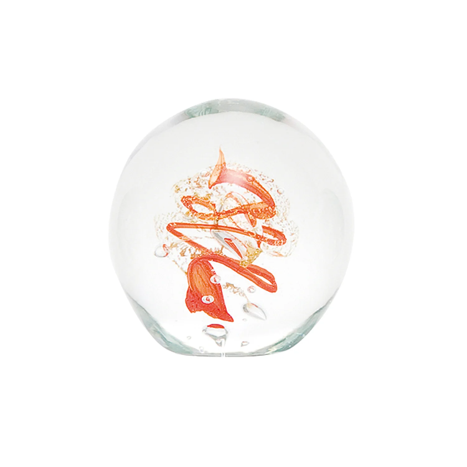Presse-papier La Rochère, collection Rumba, abritant un tourbillon graphique orange pailleté d’or. Boule en cristallin incrustée de verre coloré, soufflée-bouche et réalisée à la main en France selon les techniques artisanales ancestrales. Pièce de la cristallerie La Rochère, l’une des plus anciennes cristalleries françaises, fondée en 1475.