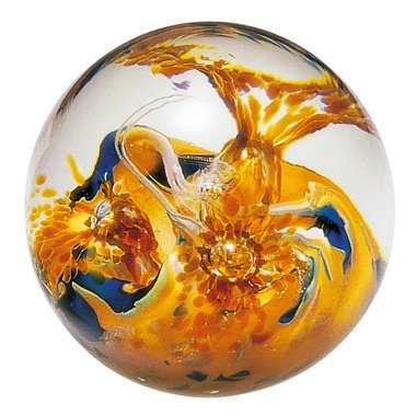 Presse-papier La Rochère, collection Vérone, mêlant des nuances de couleur or, jaune et bleue. Boule en cristallin incrustée de verre coloré, soufflée-bouche et réalisée à la main en France selon les techniques ancestrales. Fleurs & tourbillons se côtoient dans cette collection enflammée. Pièce de la cristallerie La Rochère, l’une des plus anciennes cristalleries françaises, fondée en 1475.