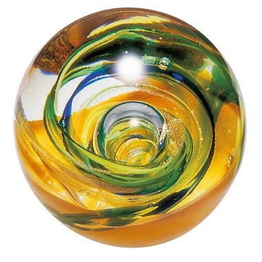 Presse-papier La Rochère, collection Vérone, mêlant des nuances de couleur verte, orange & jaune. Boule en cristallin incrustée de verre coloré, soufflée-bouche et réalisée à la main en France selon les techniques ancestrales. Fleurs & tourbillons se côtoient dans cette collection enflammée. Pièce de la cristallerie La Rochère, l’une des plus anciennes cristalleries françaises, fondée en 1475.