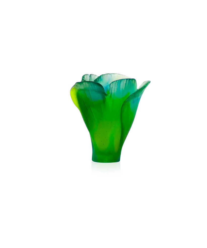 La collection Ginkgo, lancée en 2003, est une des plus emblématiques de la Maison Daum. Pour cause, évoquant la majesté des feuilles de Ginkgo, cette collection s’inspire de la nature dans toute sa splendeur. Le savoir-faire artisanal de Daum donne vie à cette pièce par le biais de la technique séculaire de pâte de verre, capturant la lumière naturelle dans des transparences colorées pour une silhouette délicate et élancée. Les courbes gracieuses du vase et les nuances de vert éclatant rappellent la sérénité des jardins, invitant à la contemplation. Création unique de la prestigieuse cristallerie Daum.