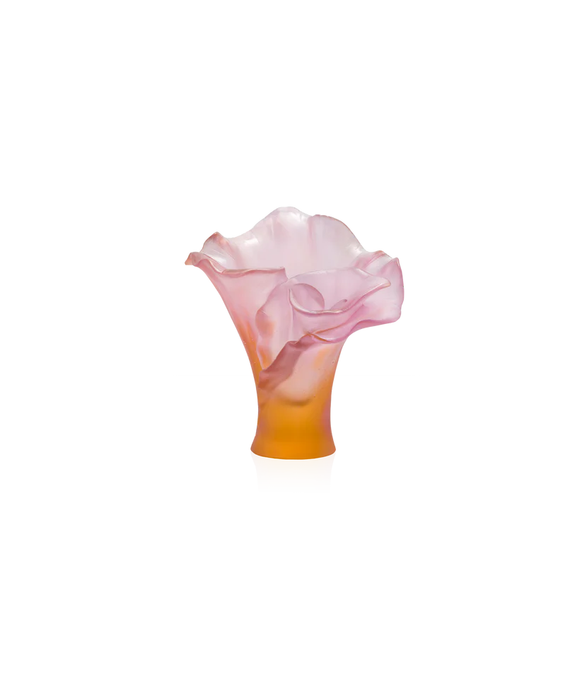 Vase Arum ambre rose, une création de la prestigieuse cristallerie Daum en pâte de verre, jouant avec les reflets de lumière. Édition numérotée.