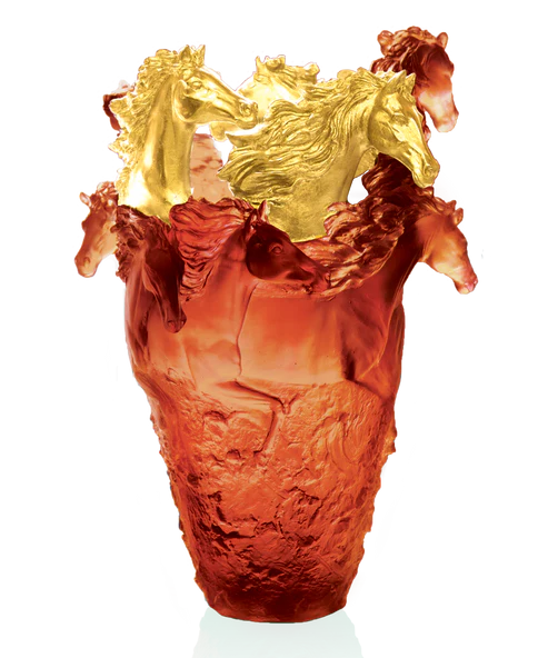 Le vase Cavalcade Daum évoque une énergie captivante. Réalisé en pâte de verre, il révèle les reflets du cristal vivant et la grâce sculptée dans la pâte de verre. Ses jeux de lumière et de transparence subliment la noblesse du mouvement, créant une aura fascinante. Cette version ambre aux trois têtes dorée capture des éclats de lumière vivants. Création unique de la prestigieuse cristallerie Daum. Modèle ambre finition or limité à 25 exemplaires.