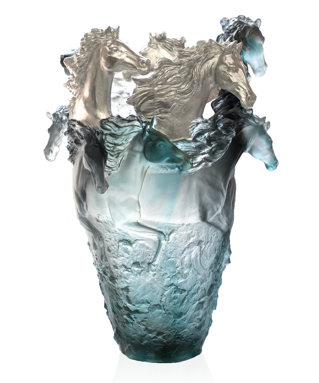 Le vase Cavalcade Daum évoque une énergie captivante. Réalisé en pâte de verre, il révèle les reflets du cristal vivant et la grâce sculptée dans la pâte de verre. Ses jeux de lumière et de transparence subliment la noblesse du mouvement, créant une aura fascinante. Et cette version bleu-gris avec trois têtes argentées, offre une véritable harmonie de cristal, inspirée de la nature, mixant élégance et éclats de lumière. Création unique de la prestigieuse cristallerie Daum. Modèle bleu-gris finition argent limité à 25 exemplaires.