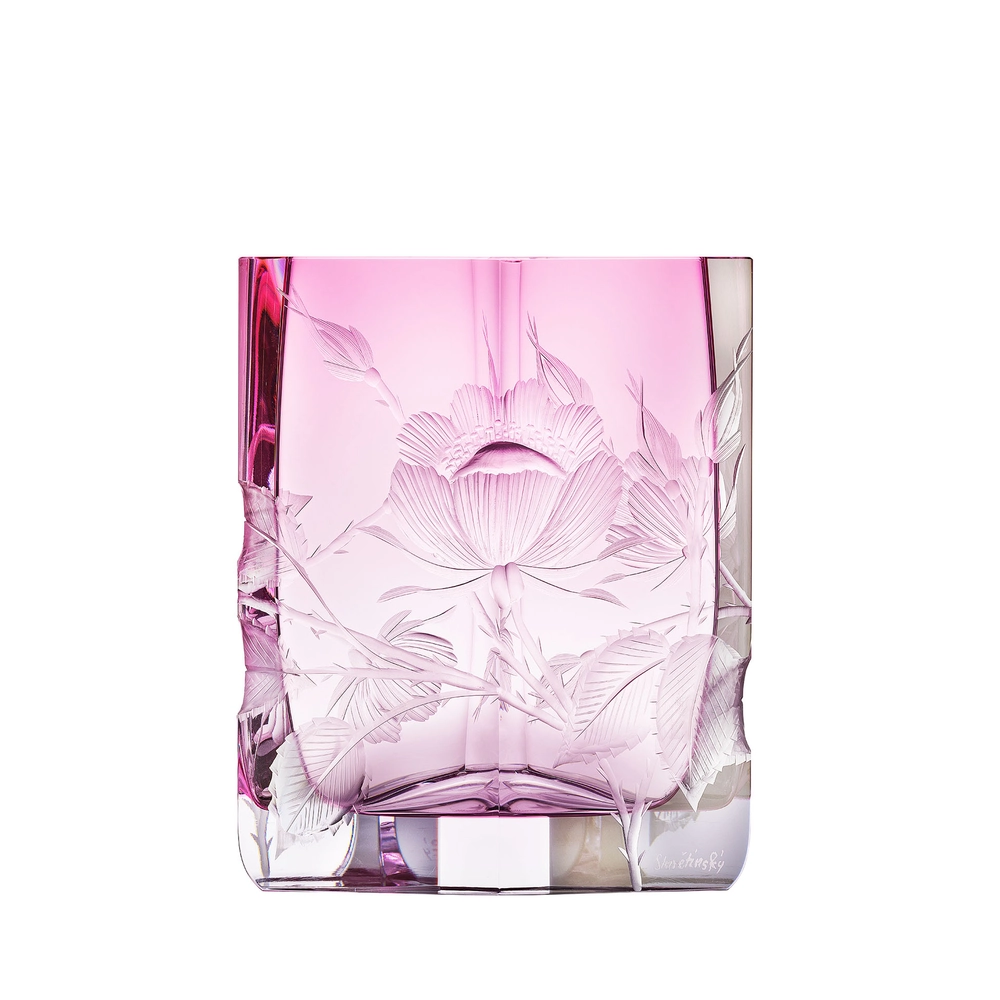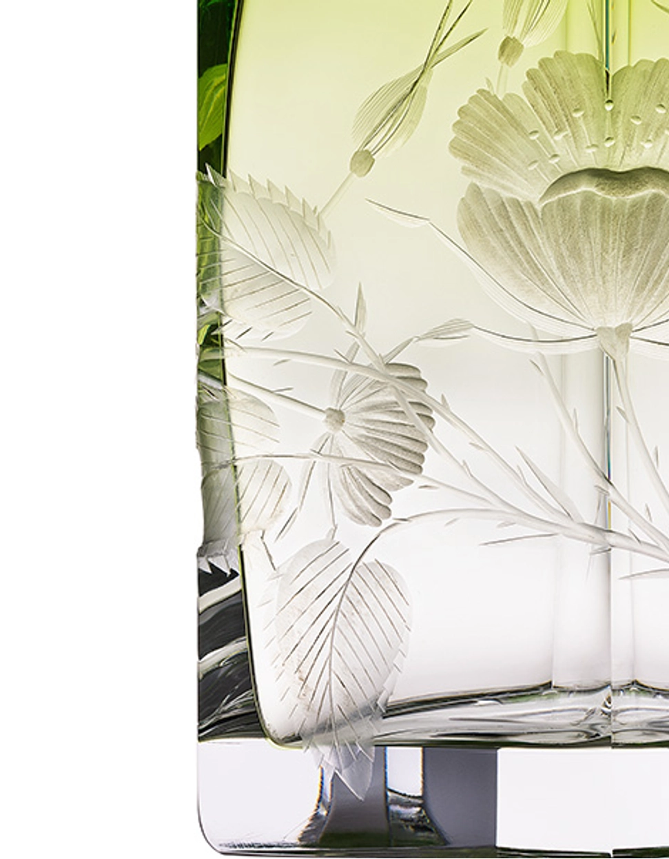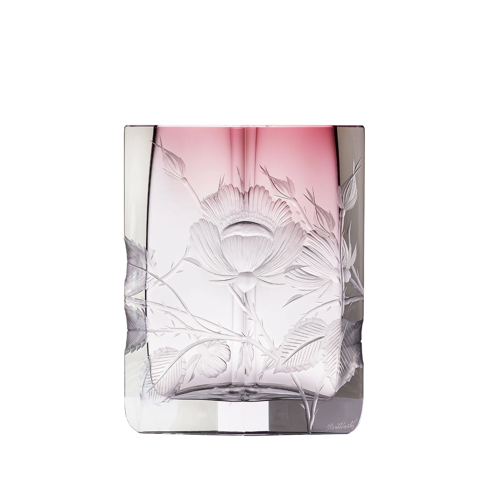 Vase « Chrysis » en authentique cristal de bohême taillé, gravé d’un magnifique motif de roses, lys & hibiscus. Collection Art Nouveau de Moser, la plus prestigieuse & réputée cristallerie de Bohême.