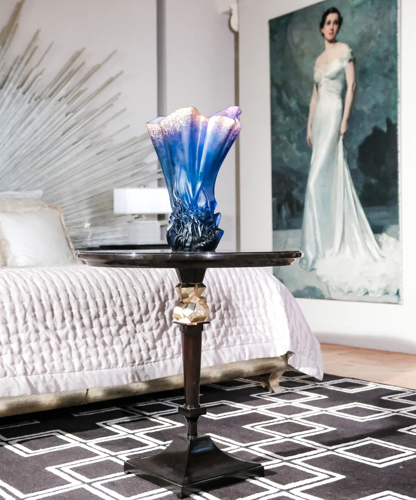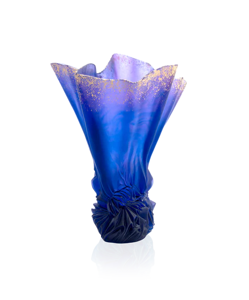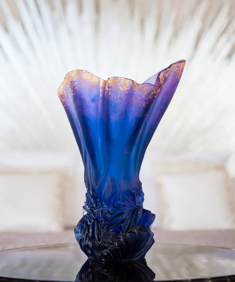 Le vase Croisière Daum évoque la lumière jouant sur les pétales de cristal. Réalisé en pâte de verre, il révèle un hommage à la nature florissante et une invitation à la contemplation. Ses jeux de lumière et de transparence subliment la douceur des formes organiques, créant une aura fascinante. Création unique de la prestigieuse cristallerie Daum. Grand modèle avec une finition à la feuille or limité à 99 exemplaires.