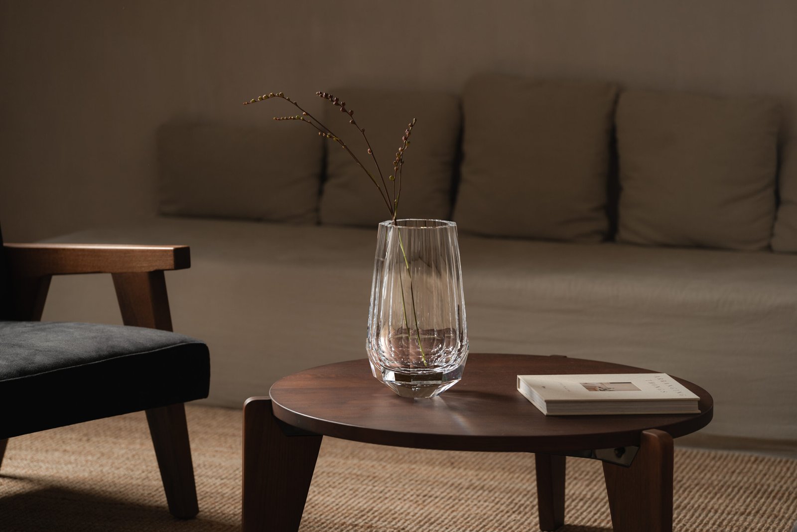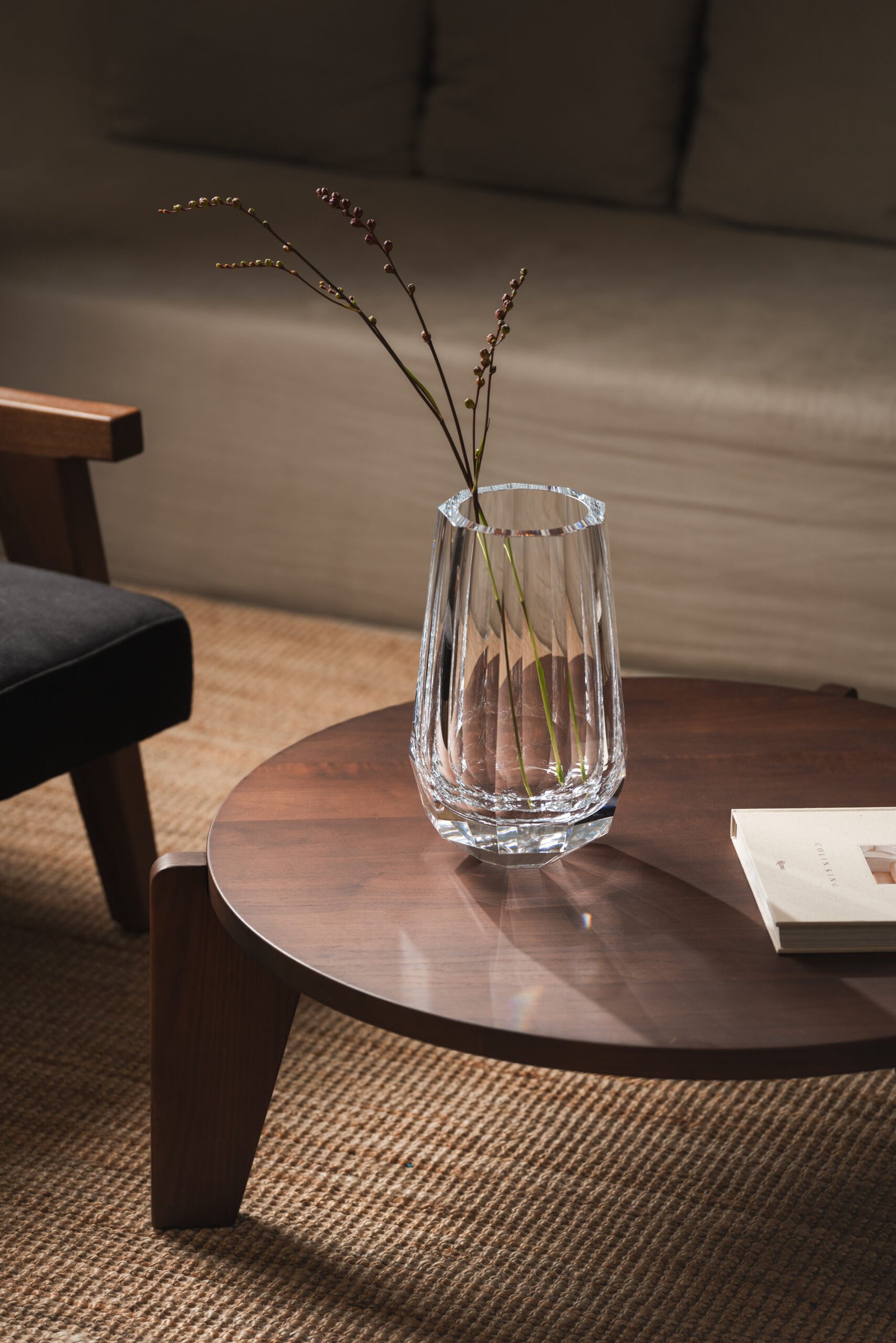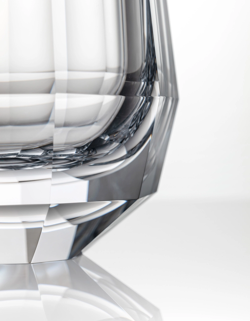 Imaginés en 2024, les vases de cette collection Drop incarnent le charme d’une goutte d’eau juste avant qu’elle ne touche le sol. Chacune des deux options de couleur capture ce miracle naturel à un moment différent de la journée : le vase Drop en béryl fumé, recouvert d’une couche de gris, capture la goutte alors qu’elle tombe à travers une obscurité veloutée. Et le vase transparent porte la fraîcheur de la rosée du matin. Grâce à la technique de sous-couche, seuls les meilleurs artisans maîtres verriers sont capables de créer un cœur de couleur différente dans le creux des vases, ce qui rend chaque pièce totalement unique. Enfin, les maîtres tailleurs apportent la touche finale aux vases avec une taille à facettes complexe. Grâce à ce design bien pensé et à leur exécution précise, la lumière traverse chaque vase comme une véritable goutte d’eau, créant des effets saisissants et le transformant en une véritable œuvre d’art.