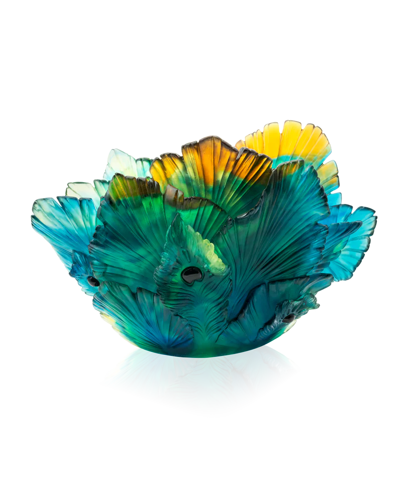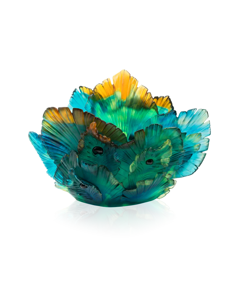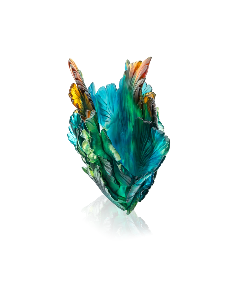 Ce vase Fleur de Paon de Daum est évidemment inspiré de la majestuosité du paon et sa parade colorée. Réalisé dans des nuances de cristal vivant, ce vase est un exemple de la maîtrise artisanale & unique de Daum pour la pâte de verre. Cette technique séculaire donne vie à des courbes gracieuses et à des transparences nuancées, révélant toute la beauté du plumage de l’oiseau. Création unique de la prestigieuse cristallerie Daum. Édition numérotée.