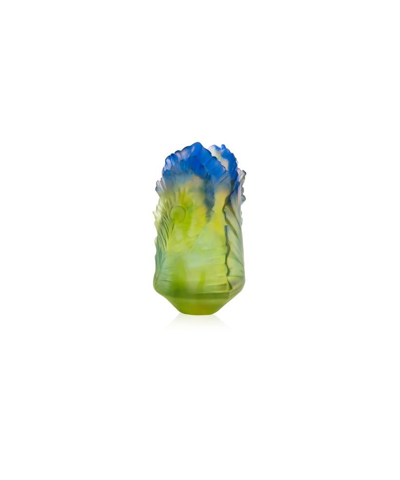 La collection Fleur de Paon de Daum est évidemment inspiré de la majestuosité du paon et sa parade colorée. Réalisé dans des nuances de cristal vivant, ce vase est un exemple de la maîtrise artisanale & unique de Daum pour la pâte de verre. Cette technique séculaire donne vie à des courbes gracieuses et à des transparences nuancées, révélant toute la beauté du plumage de l’oiseau. Cette version « Exotique » aux couleurs plus claires que la collection principale, ajoute notamment des nuances de bleu plus intenses venant sublimer les cabochons (ces petites pierres en bout de feuilles). Création unique de la prestigieuse cristallerie Daum. Édition numérotée.