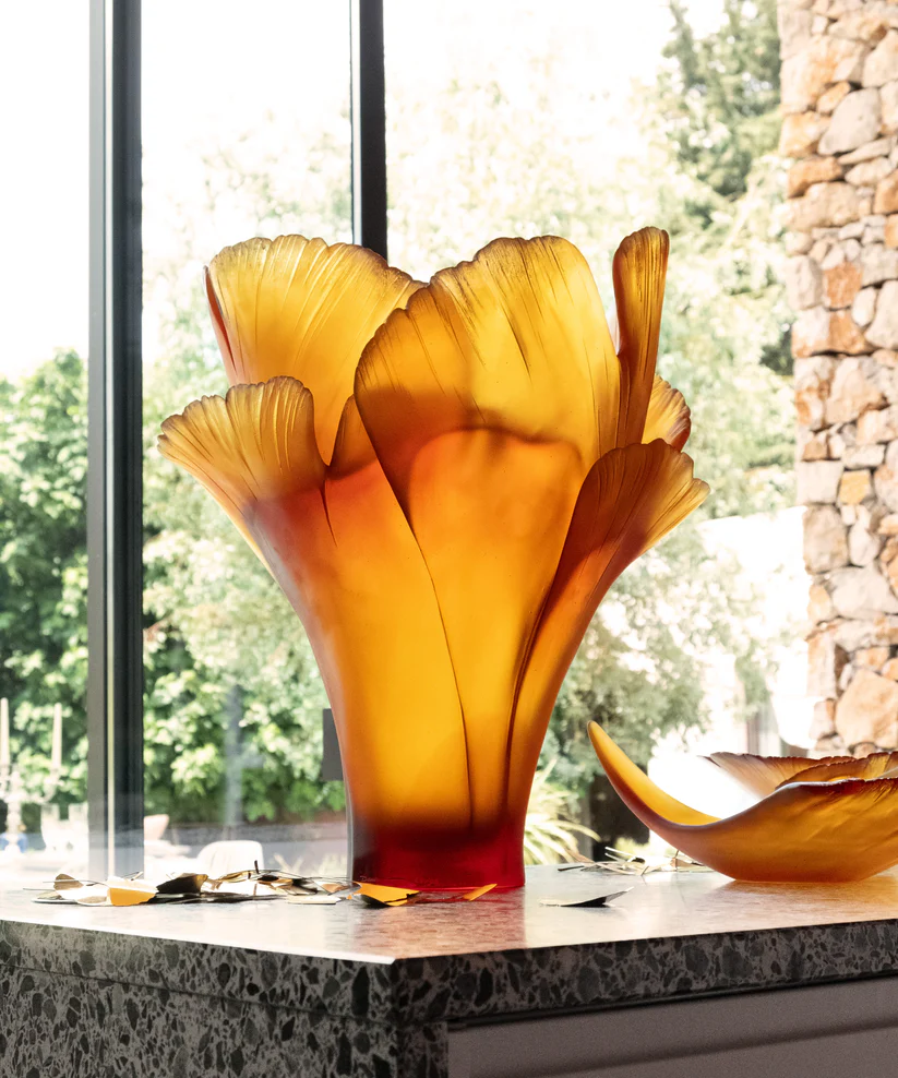• Vase ambre en pâte de verre, collection Ginkgo (une des plus emblématiques de la Maison Daum, lancée en 2003). Modèle Magnum limité à 99 exemplaires.