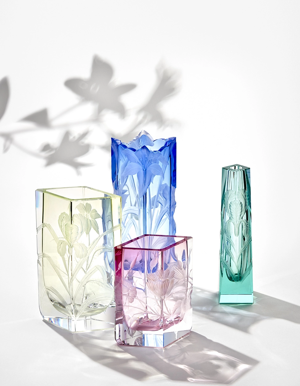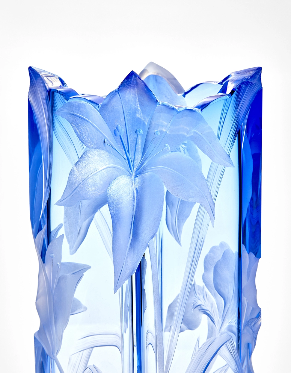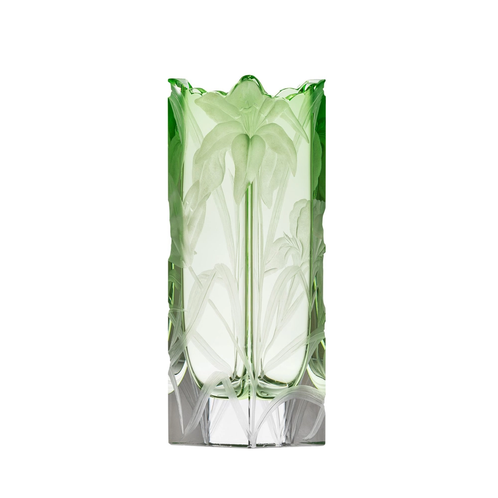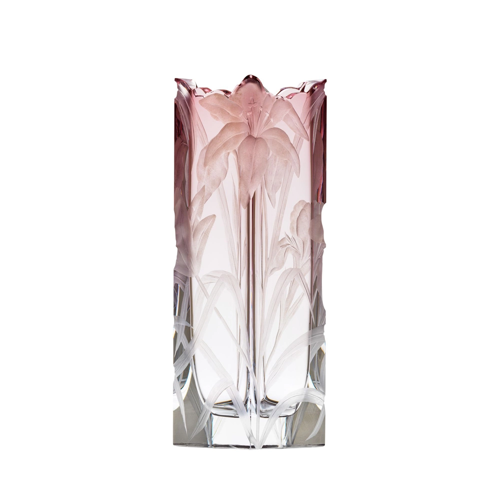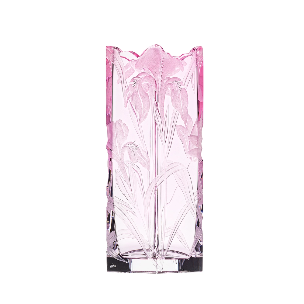 Vase « Irises » en authentique cristal de bohême taillé, gravé d’un magnifique motif d’iris. Collection Art Nouveau de Moser, la plus prestigieuse & réputée cristallerie de Bohême.