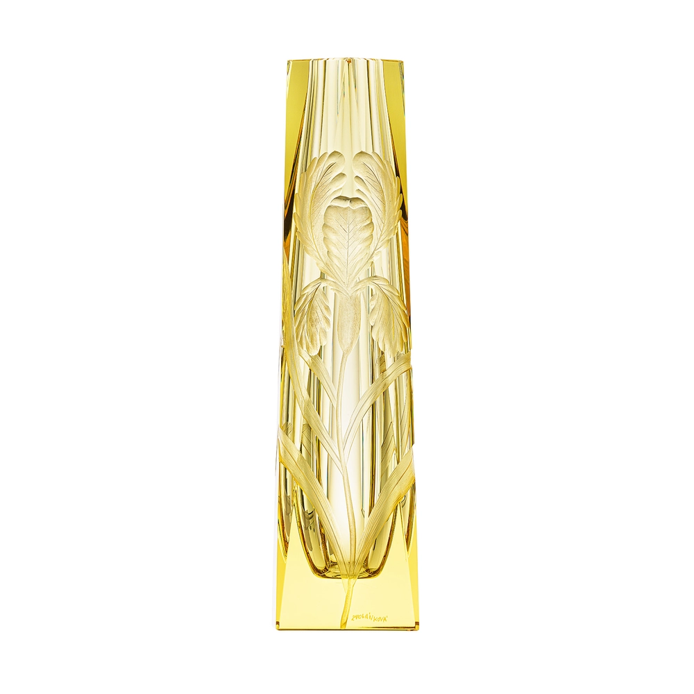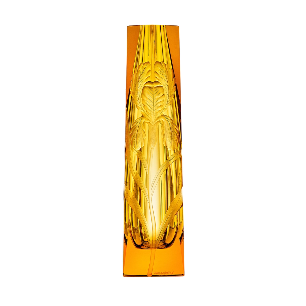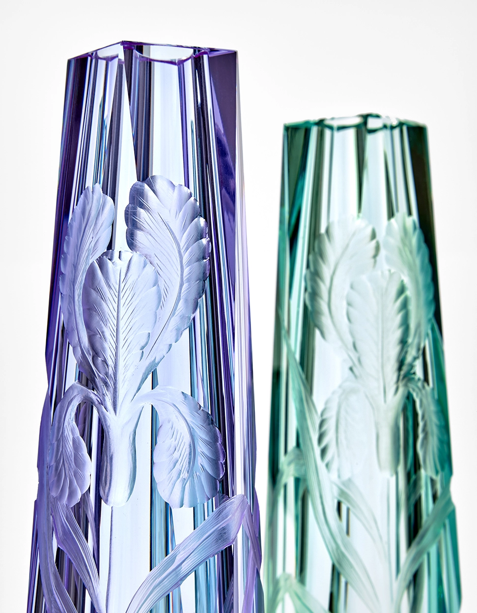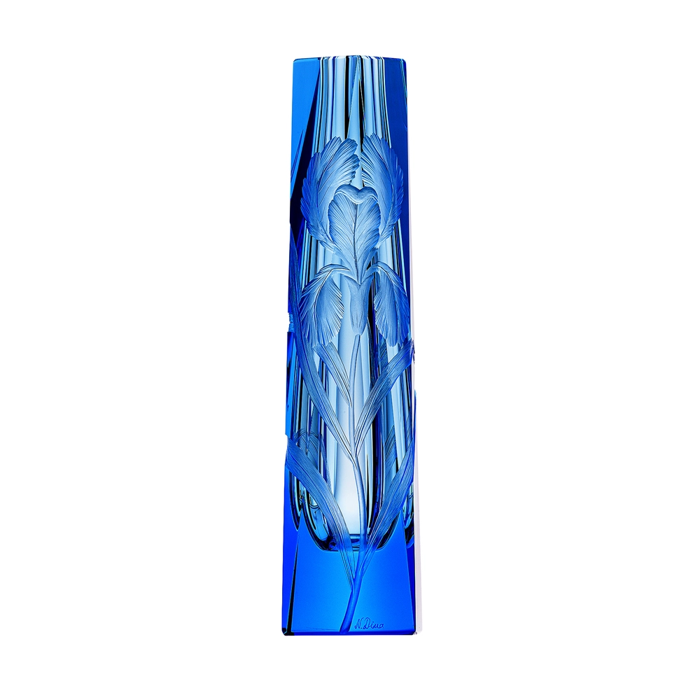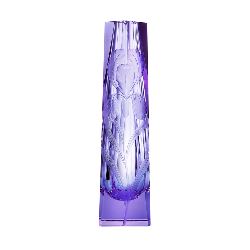 Vase « Lara » en authentique cristal de bohême taillé, gravé d’un magnifique motif d’iris. Collection Art Nouveau de Moser, la plus prestigieuse & réputée cristallerie de Bohême.