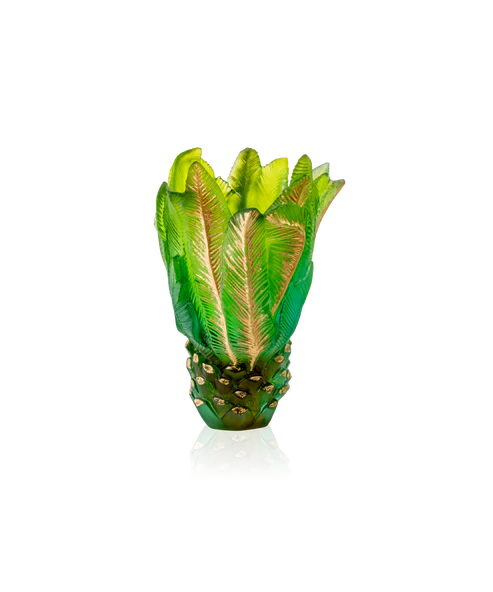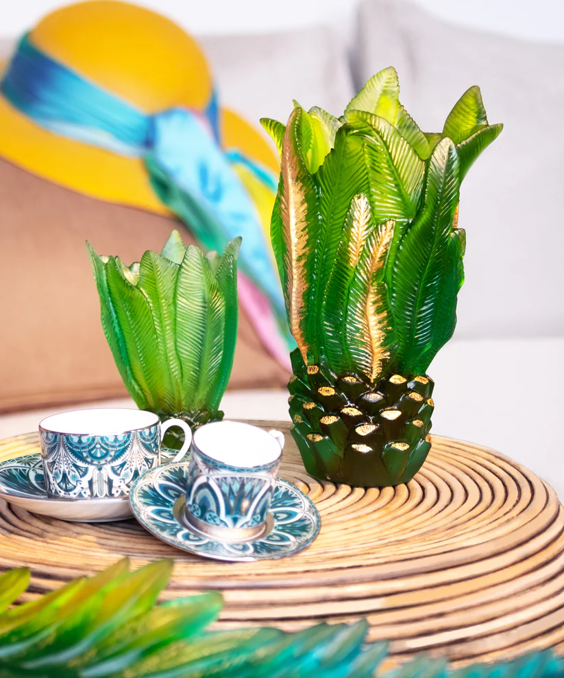 Ce vase Palm Beach Daum, en collaboration avec l’artiste Emilio Robba, évoque le murmure des fleurs. Façonné via le savoir-faire de la pâte de verre, technique séculaire maîtrisée par Daum, il révèle l’éclat des feuillages cristallins et la lumière jouant sur les pétales de cristal. Ses jeux de lumière et de transparence subliment un hommage à la nature florissante, créant une aura fascinante. Chaque détail témoigne d’un savoir-faire d’exception et d’une passion pour la création. Une œuvre poétique et intemporelle, où l’art et la nature s’unissent, empreinte unique de la prestigieuse cristallerie Daum depuis 1878. Modèle limité à 225 exemplaires.