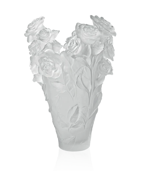 Ce vase Rose Passion Daum, inspiré par la beauté délicate et la pureté d’une rose en pleine floraison, incarne la passion et la tendresse. Façonné & fabriqué à la main dans une pâte de verre (technique séculaire maîtrisée par Daum qui confère à chaque pièce une individualité unique), les nuances subtiles de blanc évoquant les pétales de la rose, capturent et diffusent gracieusement la lumière. Ses courbes gracieuses et son col élancé créent une silhouette imposante à ce vase, qui, même vide, attire le regard et invite à la contemplation. Une pièce de choix pour sublimer vos espaces avec l’élégance et le charme naturel d’une rose passion. Création unique de la prestigieuse cristallerie Daum. Modèle limité à 50 exemplaires.