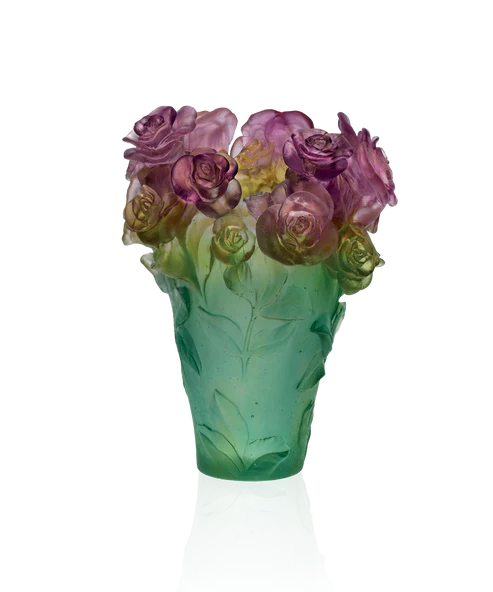 Ce vase Rose Passion Daum, inspiré par les couleurs vibrantes et les formes délicates des roses, évoque la beauté de la nature à chaque regard. Il est façonné & fabriqué à la main dans une pâte de verre aux nuances de rose et de vert, technique séculaire maîtrisée par Daum, donnant vie à une délicate palette de roses et de verts. Ses transparences nuancées interagissant avec la lumière pour créer un spectacle visuel captivant. Les courbes gracieuses de ce vase capturent la lumière naturelle, et son col élancé travaillé avec soin lui confèrent une présence délicate, mais imposante. Création unique de la prestigieuse cristallerie Daum. Édition numérotée.