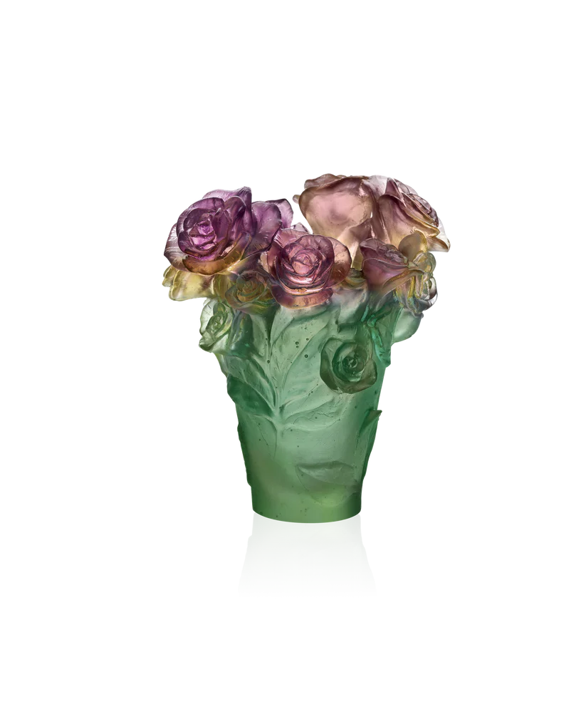 Ce vase Rose Passion Daum, inspiré par les roses en pleine floraison, évoque les merveilles de la nature se révélant au printemps. Il est façonné & fabriqué à la main dans une pâte de verre aux nuances de rose et de vert, technique séculaire maîtrisée par Daum, donnant vie à une délicate palette de roses et de verts. Ses transparences nuancées interagissant avec la lumière pour créer un spectacle visuel captivant. Les courbes gracieuses de ce vase capturent la lumière naturelle, et son col élancé travaillé avec soin lui confèrent une présence délicate, mais imposante. Création unique de la prestigieuse cristallerie Daum. Édition numérotée.