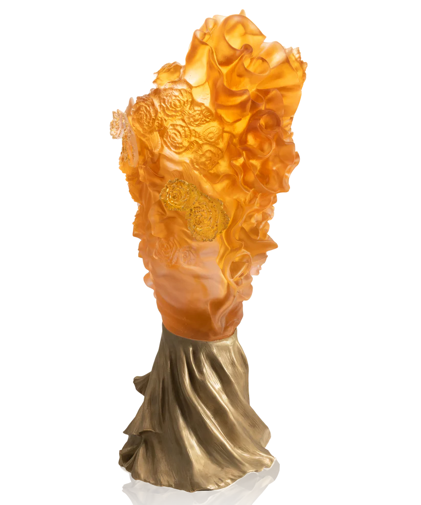 Ce vase Rose Royale Daum, inspiré des somptueux jardins royaux en fleur, incarne la beauté naturelle transformée en une œuvre d’art. Façonné & sculpté avec soin à la main dans la pâte de verre, technique séculaire maîtrisée par Daum, des courbes gracieuses et un col élancé s’unissent dans une danse de transparences nuancées, tandis que l’or rose ajoute une touche de luxe. Les couleurs non précisées, comme un secret bien gardé, invitent à une découverte sensorielle à chaque regard. Imposant par sa présence, ce vase sublimera votre espace, qu’il soit ornementé de fleurs ou contemplé dans sa splendeur solitaire. Laissez-vous émerveiller par cette symphonie de cristal, où chaque éclat de lumière raconte une histoire de maîtrise artisanale et d’élégance raffinée, rappelant toute l’exigence de l’art verrier. Création unique de la prestigieuse cristallerie Daum. Modèle limité à 50 exemplaires.