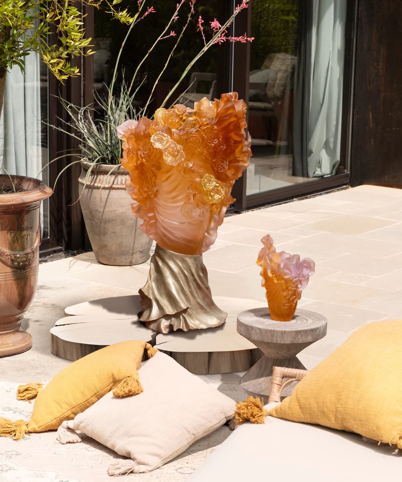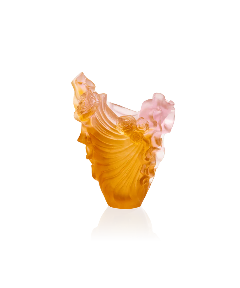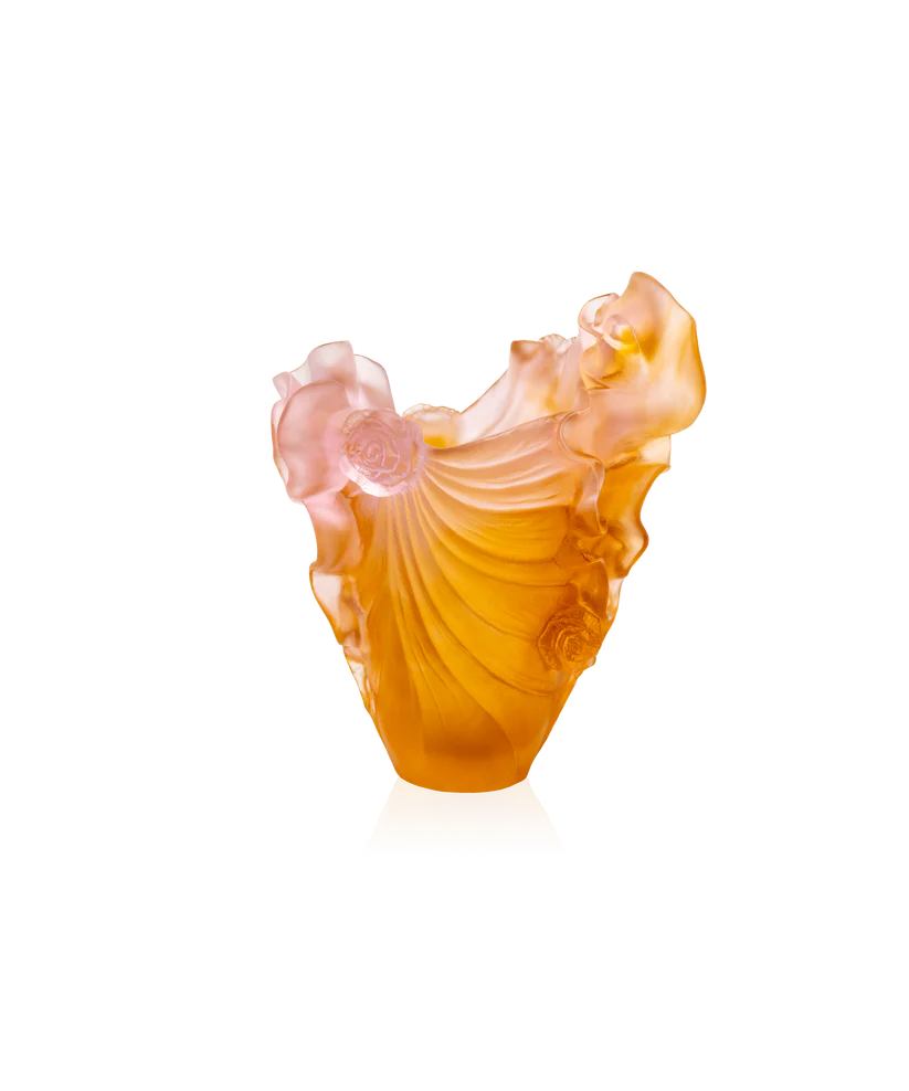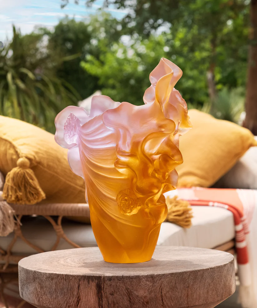 Ce vase Rose Royale Daum, évoquant la majesté des jardins royaux en fleur, est une ode à la beauté naturelle. Façonné avec soin à la main en cristal coloré, il révèle des courbes gracieuses et un col élancé, capturant la lumière pour lui donner vie. La pâte de verre, technique séculaire maîtrisée par Daum, confère à chaque pièce une transparence nuancée unique, mettant en valeur les éclats de lumière. Qu’il soit garni de fleurs délicates ou laissé vide pour être contemplé, ce vase apportera une touche d’élégance et de raffinement à votre espace. Invitez votre regard à se perdre dans ses nuances poétiques et laissez-vous envoûter par sa beauté intemporelle, rappelant toute l’exigence de l’art verrier. Création unique de la prestigieuse cristallerie Daum. Modèle limité à 225 exemplaires.