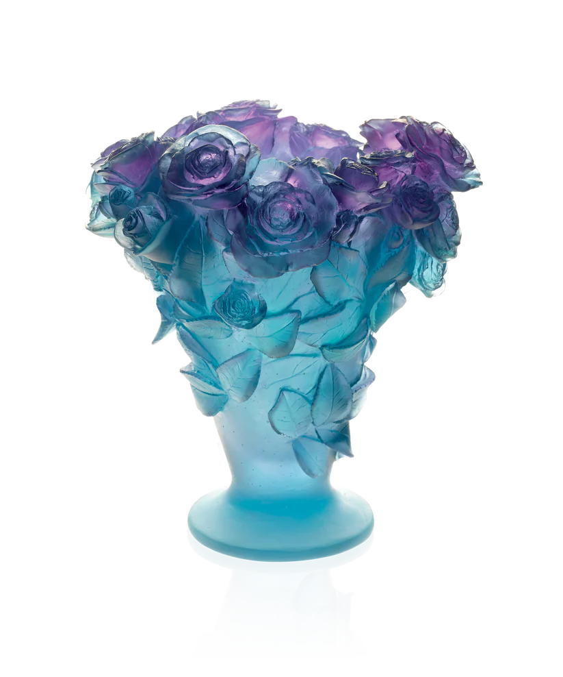 Ce vase Roses Daum, inspiré de la beauté naturelle et éphémère des roses, évoque les jardins en pleine floraison. Façonné & sculpté avec soin à la main dans la pâte de verre, technique séculaire maîtrisée par Daum, sa couleur ultraviolet crée un spectacle de transparences colorées et aux couleurs vibrantes. Le col élancé et généreux du vase sublime les fleurs qu’il accueille, capturant la lumière naturelle pour créer un spectacle de reflets changeants. Ce vase délicat, par sa présence élancée, apporte une touche de poésie et de raffinement à votre intérieur, invitant à la contemplation de sa beauté à chaque instant, et rappelant toute l’exigence de l’art verrier artisanal. Création unique de la prestigieuse cristallerie Daum. Édition numérotée.