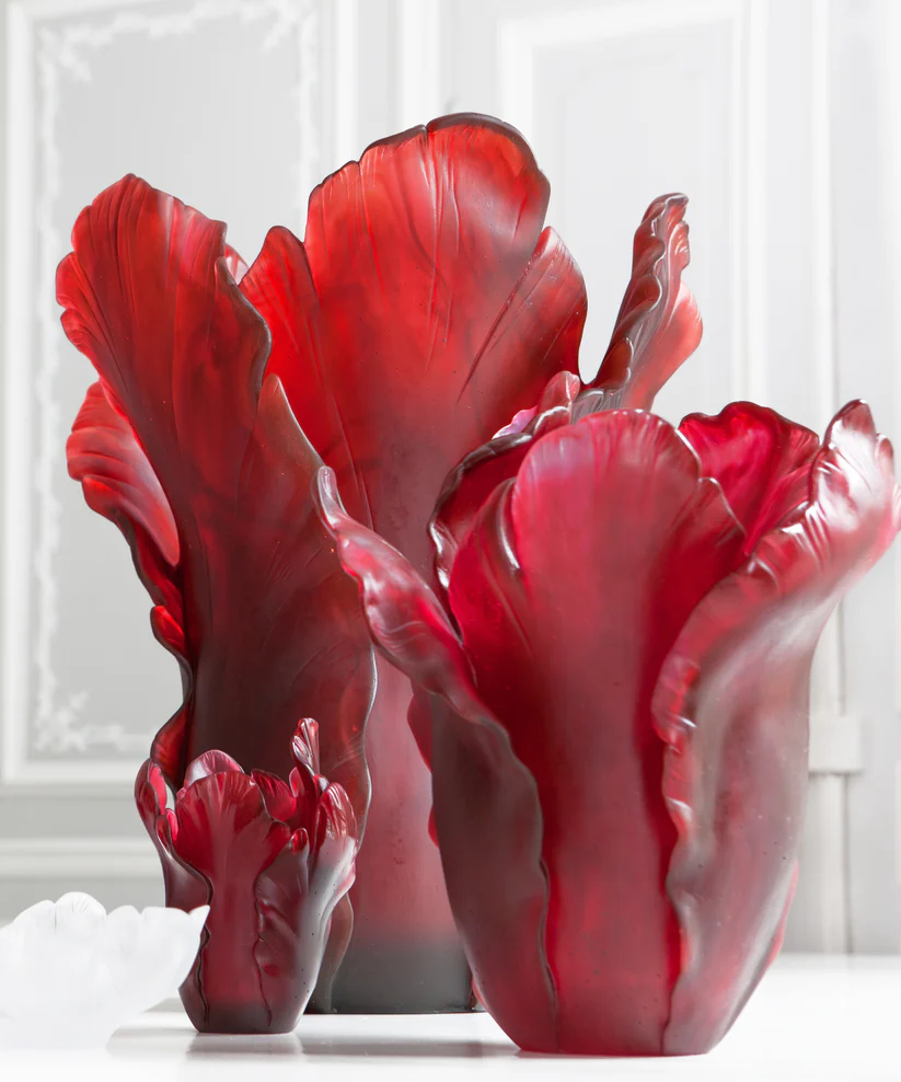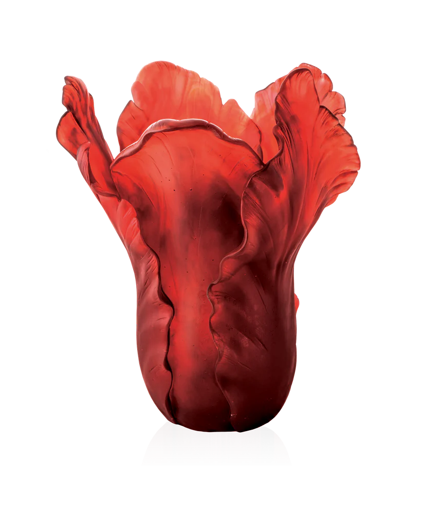 Ce vase Tulipe Daum « rouge à l’or », inspiré par la beauté éphémère de la tulipe, évoque la splendeur des jardins en pleine floraison. Façonné & sculpté avec soin à la main dans la pâte de verre, technique séculaire maîtrisée par Daum, sa surface vibre d’éclats de lumière, révélant une palette de transparences colorées. La présence de l’or sublime encore plus la générosité de ses formes et la vivacité de sa couleur. Véritable œuvre d’art, ce vase apportera une touche d’élégance et de raffinement à votre espace, invitant à la contemplation et à l’admiration de la beauté naturelle. Création unique de la prestigieuse cristallerie Daum. Modèle limité à 50 exemplaires.