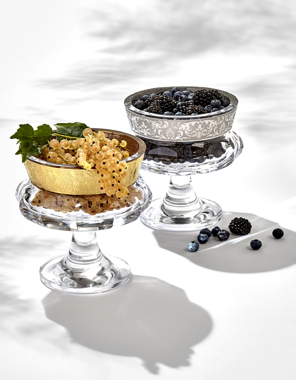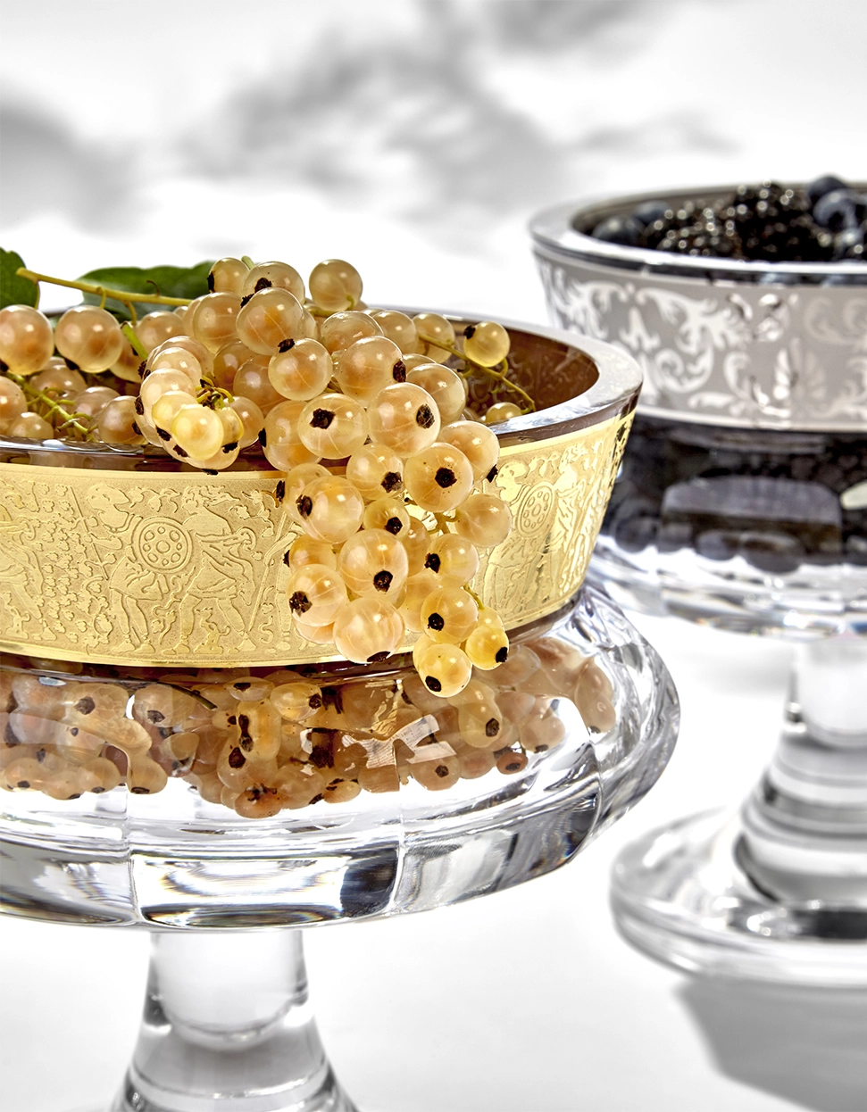 Imaginée en 1926 par Leo Moser en personne (le créateur de la cristallerie Moser), le bol à pied Mirth attire le regard par sa forme sophistiquée divisée en trois sections clairement délimitées. Il se distingue particulièrement lorsqu’il est associé à des raisins, des groseilles ou d’autres petits fruits qui s’harmonisent bien avec la généreuse décoration dorée sur le bord.