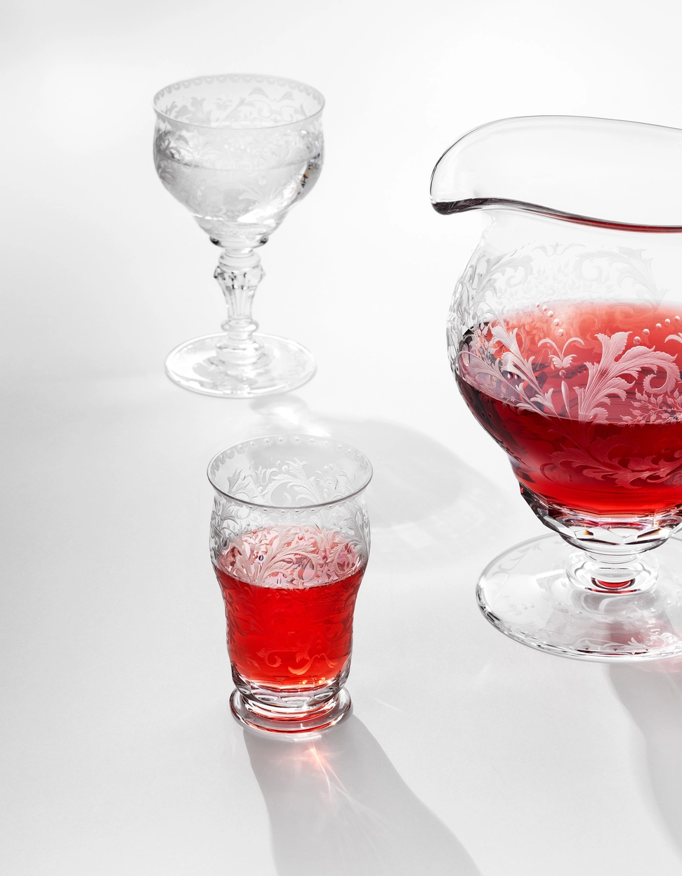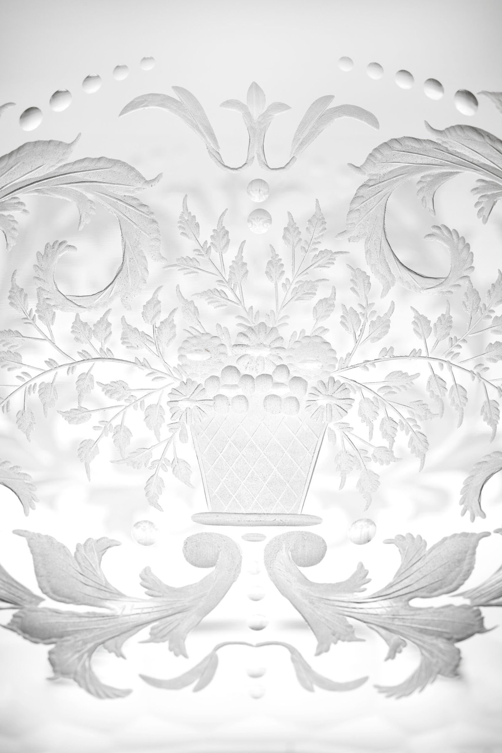 Imaginée en 1936 et inspirée d’un dessin d’Arnold Zadikow, la collection Baroque est l’une des plus exigeantes techniquement du répertoire Moser. Et en termes de savoir-faire artisanal de façon générale. La collection se distingue par la forme & le décor unique gravé à la main sur chaque pièce qui semble, à première vue, tissé à partir de la dentelle la plus fine. Le motif recouvre toute la coque des calices, et réapparaît également sur le pied. Ayant comme slogan « la beauté du passé », le motif de cette collection, inspiré des motifs floraux caractéristiques de la période baroque du XVIIIe siècle, représente des feuilles d’acanthe denses.