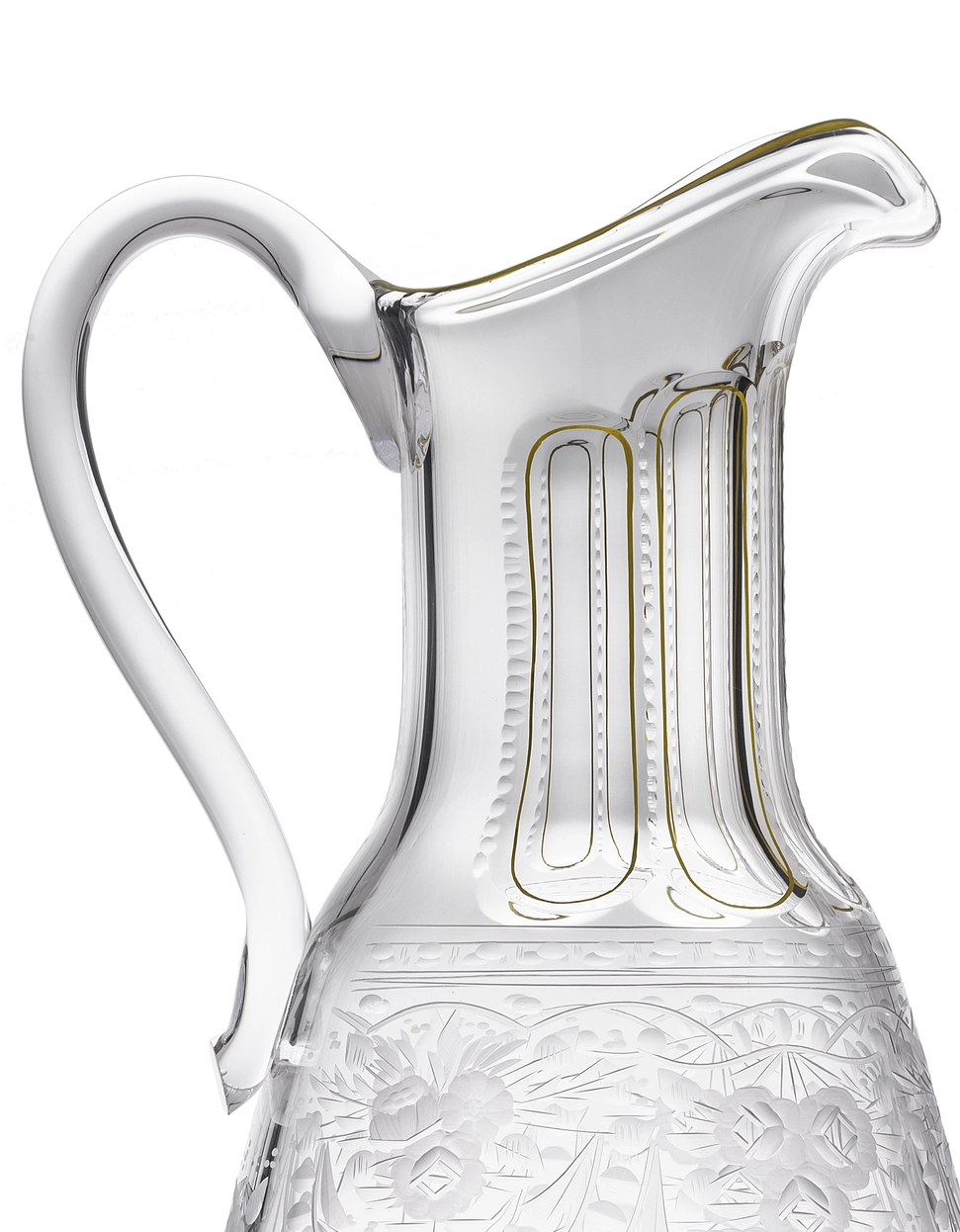 Carafe à eau en authentique cristal de bohême taillé, gravé artistiquement, et subtilement décoré avec des lignes en or 24 carats peintes à la main. Création signée Moser, la plus prestigieuse & réputée cristallerie de Bohême. Collection Maharani imaginée en 1895 pour l’épouse du maharaja de Travancore.