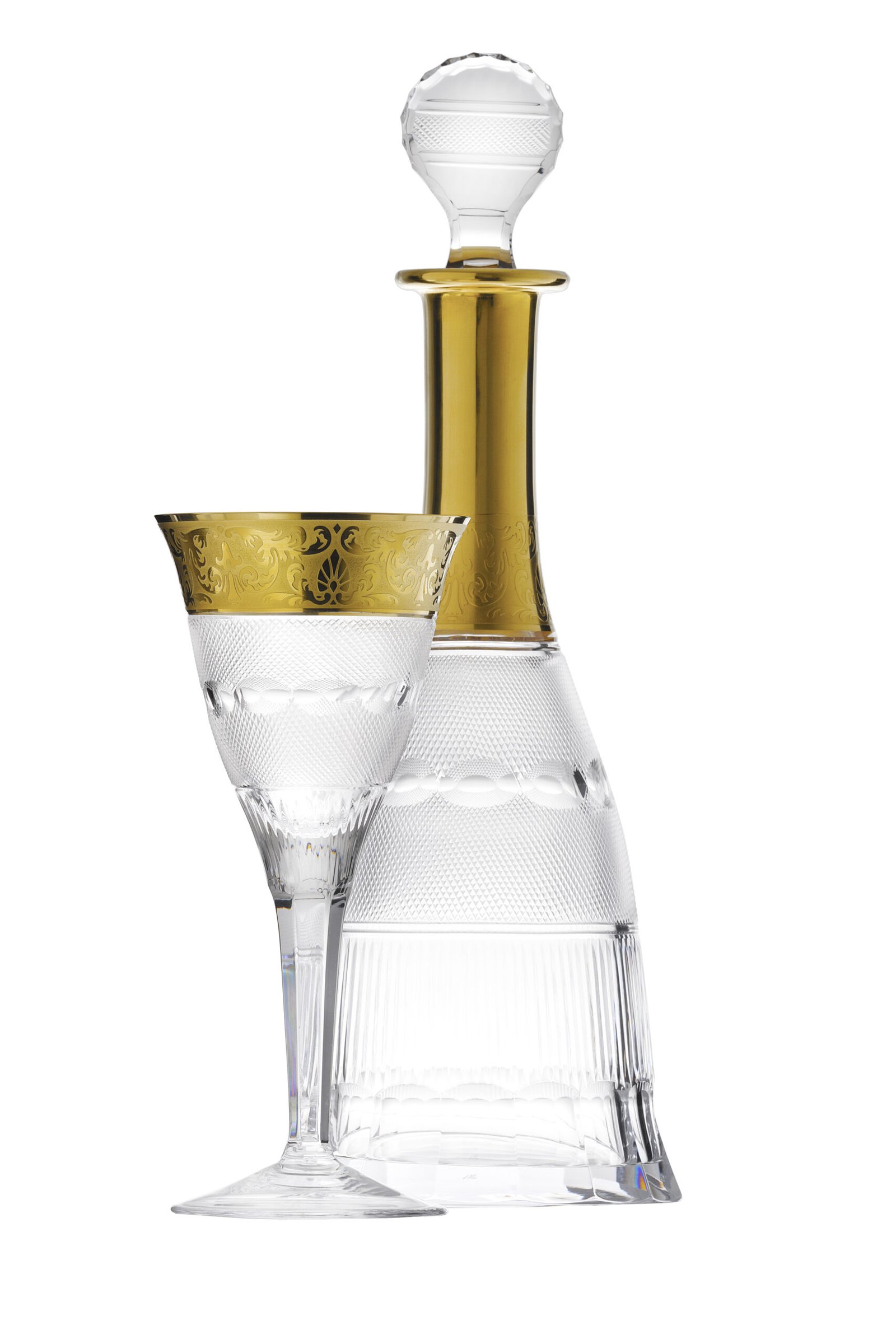 Décanteur à vin (peut aussi convenir pour certains whisky) en authentique cristal de bohême taillé, avec un bandeau en or 24 carats. Collection Splendid de Moser, la plus prestigieuse & réputée cristallerie de Bohême. Collection créée en 1911 par Leo Moser (le fondateur de Moser) qui reste encore aujourd’hui la plus luxueuse de toute l’histoire de la Maison.