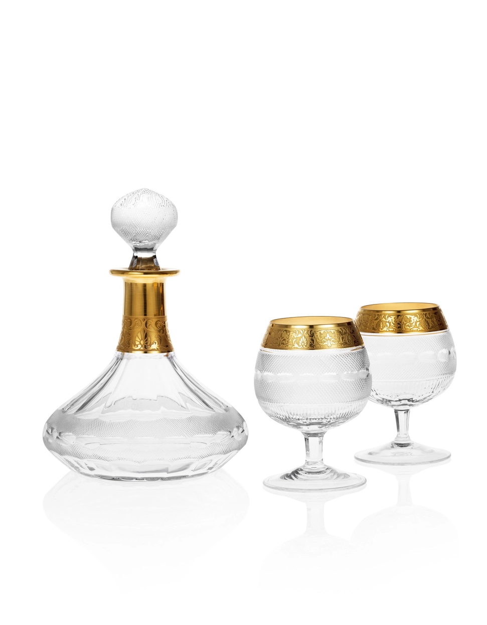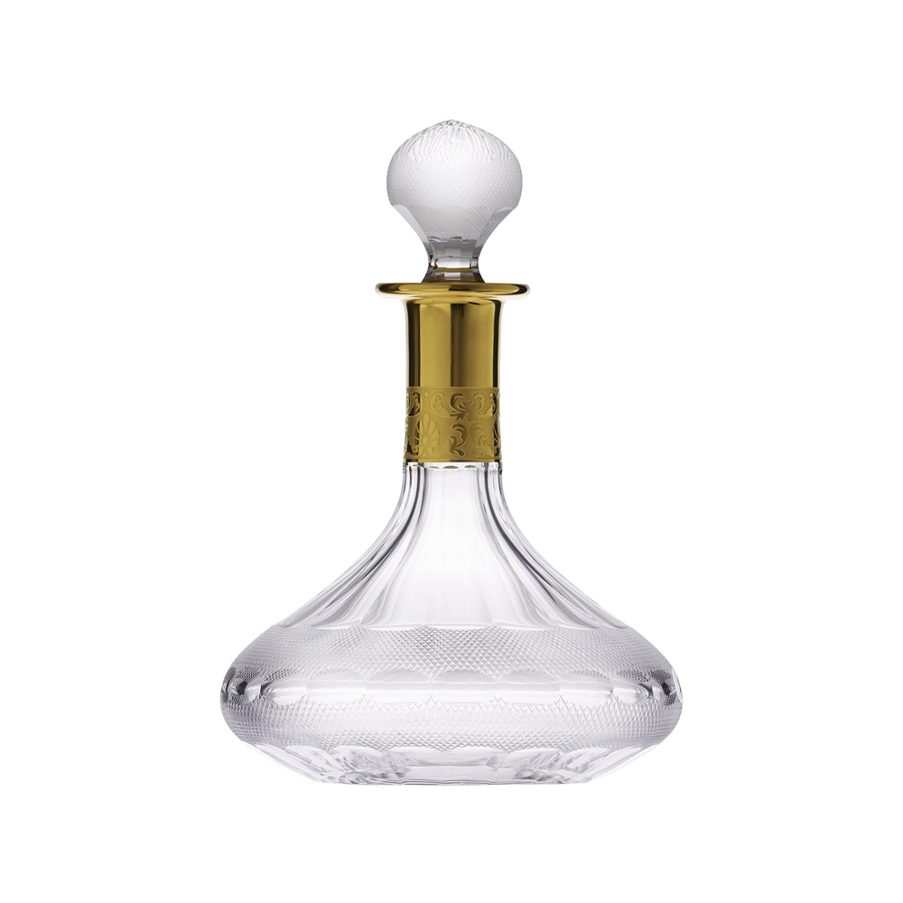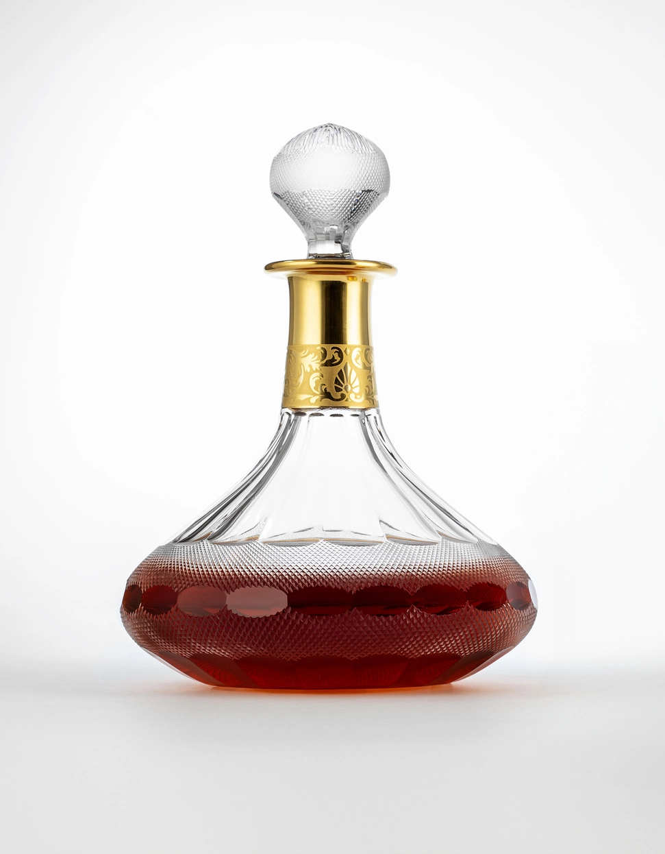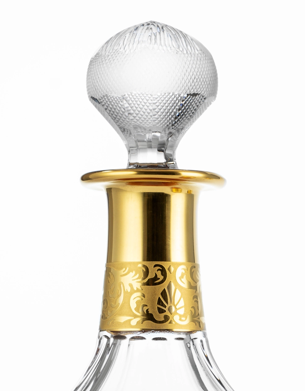 Décanteur pour brandy & cognac (convient également pour le rhum) en authentique cristal de bohême taillé, avec un bandeau en or 24 carats. Collection Splendid de Moser, la plus prestigieuse & réputée cristallerie de Bohême. Collection créée en 1911 par Leo Moser (le fondateur de Moser) qui reste encore aujourd’hui la plus luxueuse de toute l’histoire de la Maison.