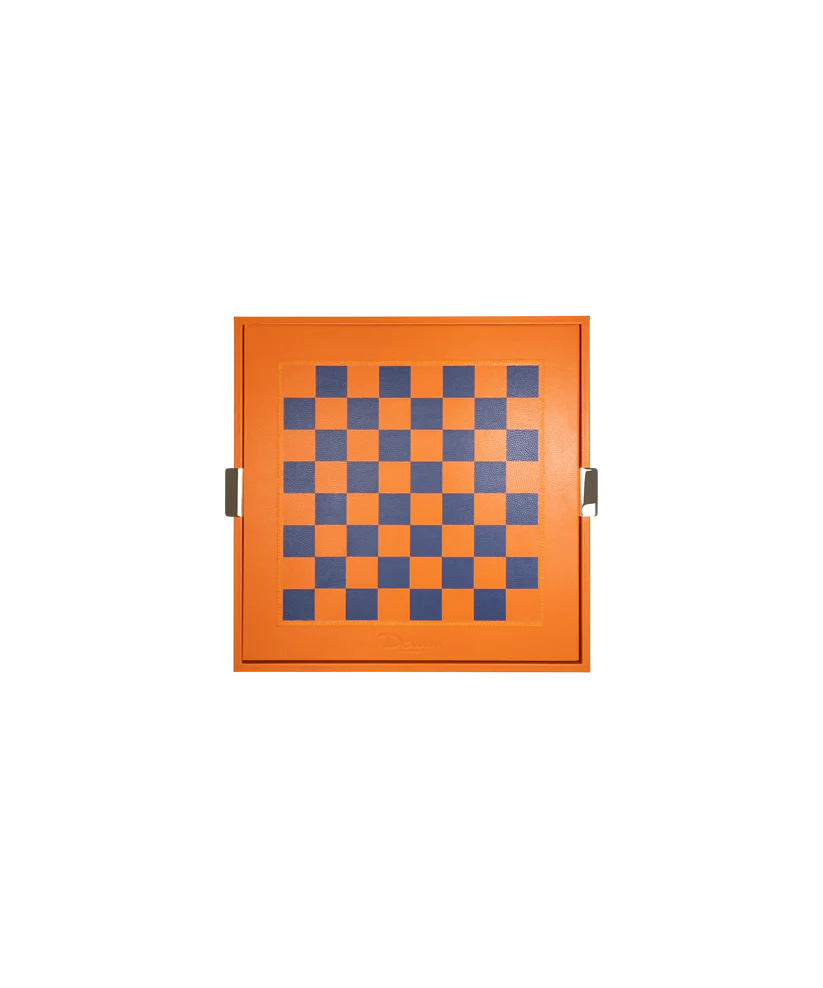 Plateau de jeu en marqueterie de cuir orange et bleu marine, surpiqué ton sur ton.