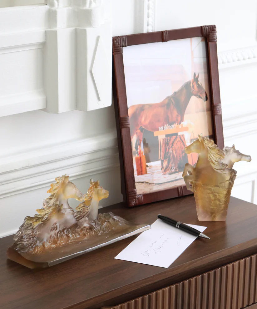 Ce porte-crayon brun glacé Daum, issu de la collection Cavalcade, évoque la noblesse du mouvement. Façonné en pâte de verre, technique séculaire maîtrisée par Daum, il révèle une présence magnétique et la puissance du monde sauvage. Ses jeux de lumière et de transparence subliment l’élégance naturelle, créant une aura fascinante. Chaque détail témoigne d’un savoir-faire d’exception et d’une passion pour la création. Une œuvre poétique et intemporelle, où l’art et la nature s’unissent. Création unique de la prestigieuse cristallerie Daum. Édition numérotée.