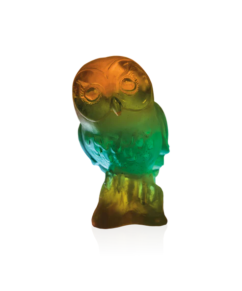 Cette chouette Daum, inspirée de l’élégante chouette Edwige, évoque la majesté de la nature nocturne. Grâce à la pâte de verre, technique séculaire maîtrisée par Daum, la sculpture se pare de transparences colorées aux nuances de vert et d’ambre, reflétant des éclats de lumière fascinants. Cette œuvre artisanale, aux détails délicats et au mouvement figé, apporte une présence magnétique à tout espace, invitant à une contemplation silencieuse de la beauté naturelle et de l’art verrier de la prestigieuse cristallerie Daum. Édition numérotée.