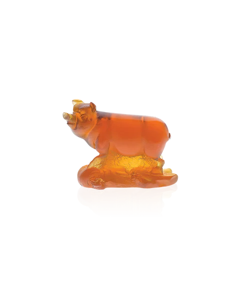 Ce cochon Daum, inspiré de l’univers mystique de l’horoscope chinois, convoque la force sereine de cet animal. Façonnée à la main en pâte de verre ambre, technique séculaire maîtrisée par Daum, cette sculpture révèle une maîtrise artisanale remarquable, marquant chaque détail de l’animal dans un éclat de lumière captivant. Les nuances de l’ambre, délicates et chaleureuses, évoquent les nuances du crépuscule. Cet objet de décoration, imposant par son expression et délicat dans ses détails, invite à la contemplation, apportant une présence magnétique à votre espace. Création unique de la prestigieuse cristallerie Daum.