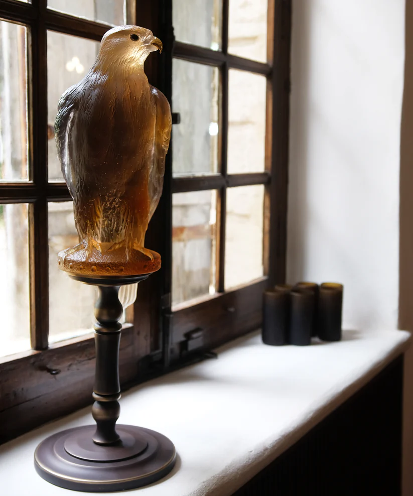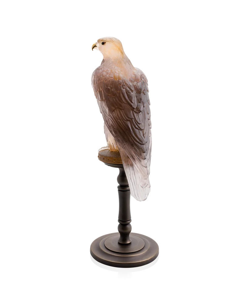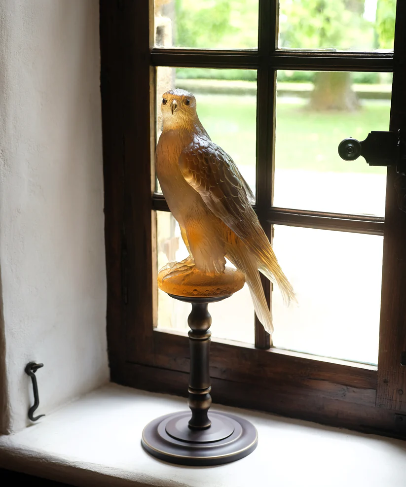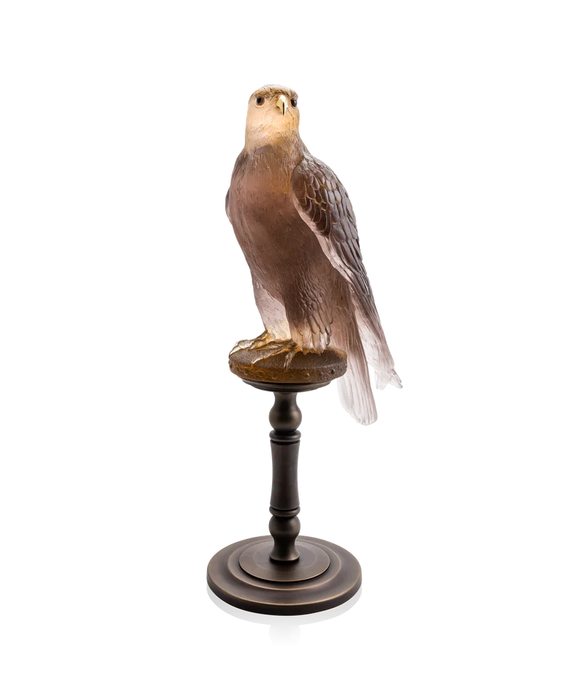 Ce Faucon Gerfaut Daum en ambre rose, réalisé en collaboration avec l’artiste Madeleine Van Der Knoop et s’inspirant du vol puissant de l’oiseau, capture l’essence de la nature dans un moment éternel. Façonnée à la main en pâte de verre ambre rose, technique séculaire maîtrisée par Daum, l’œuvre dévoile des nuances de couleurs changeantes et des éclats de lumière qui donnent vie au cristal. L’expression saisissante et le mouvement figé de la sculpture créent une présence magnétique qui attire le regard et invite à la contemplation. Cette pièce imposante apporte une élégance raffinée et une beauté naturelle à tout espace, grâce à la maîtrise artisanale inégalée de la prestigieuse cristallerie Daum depuis 1878. Édition limitée à 125 exemplaires.