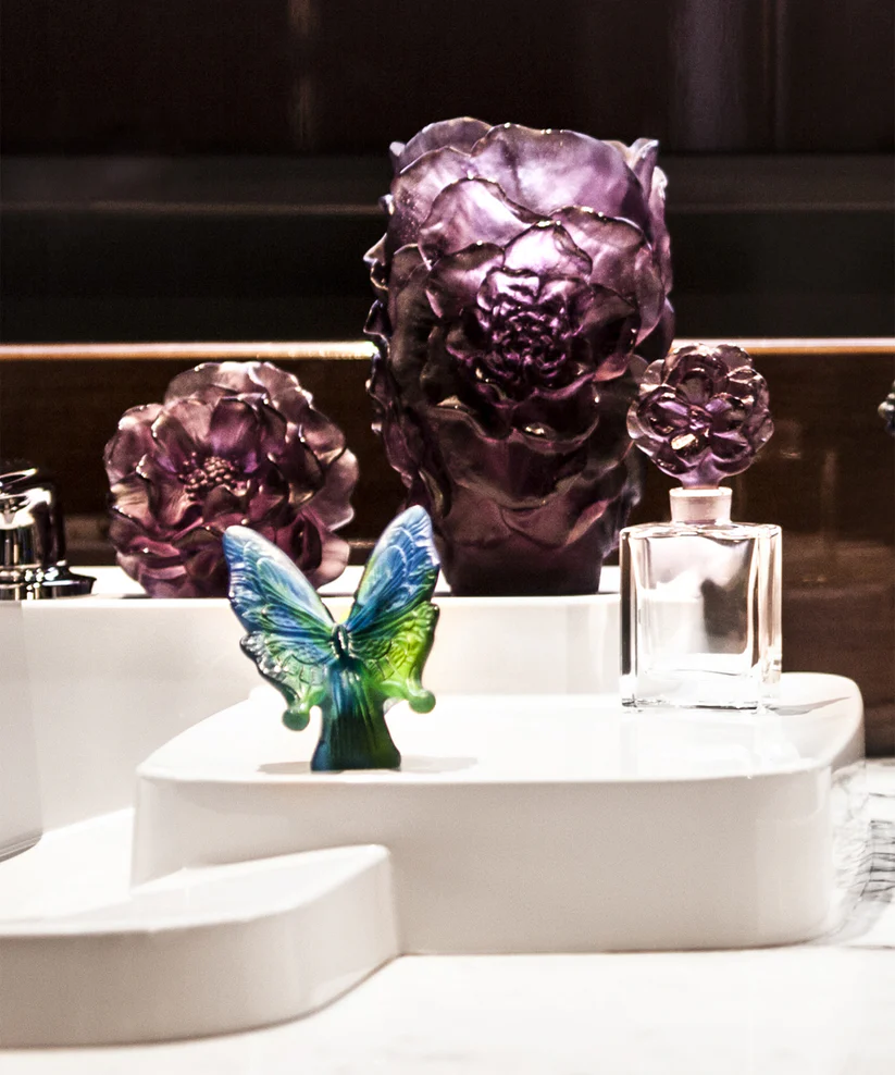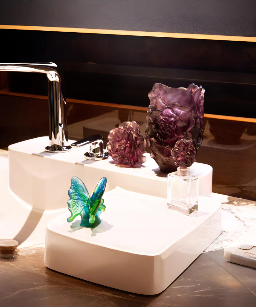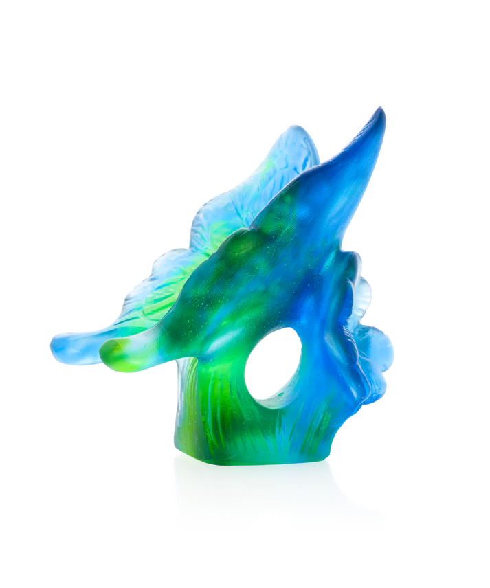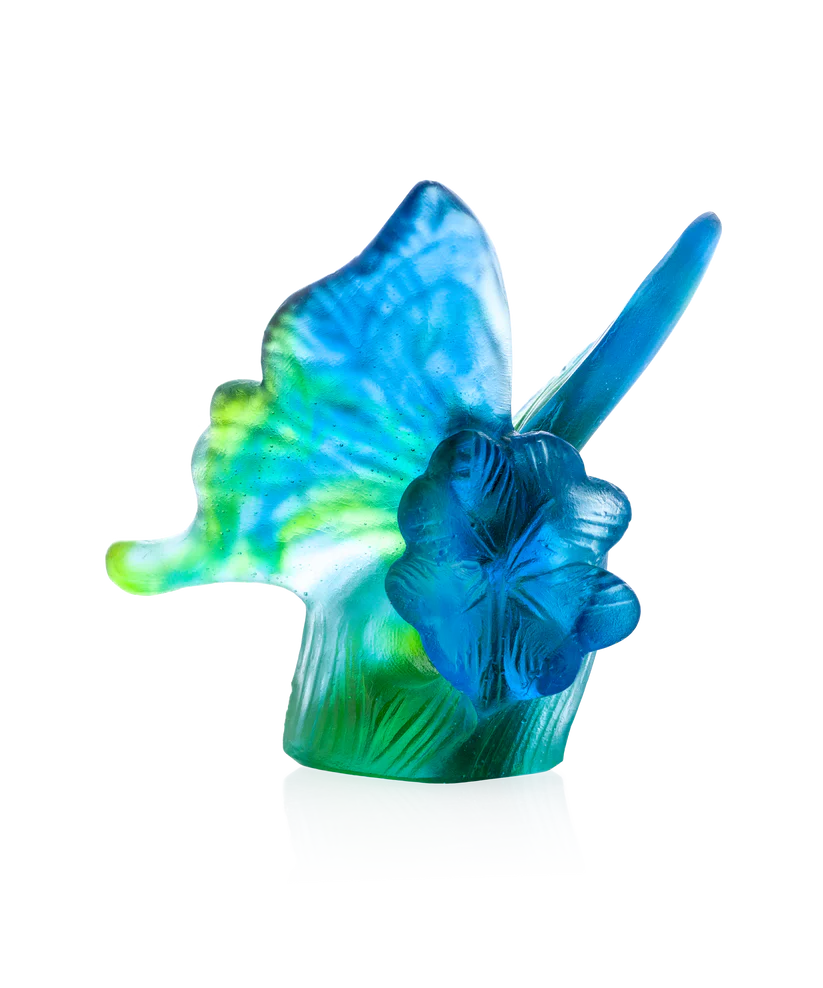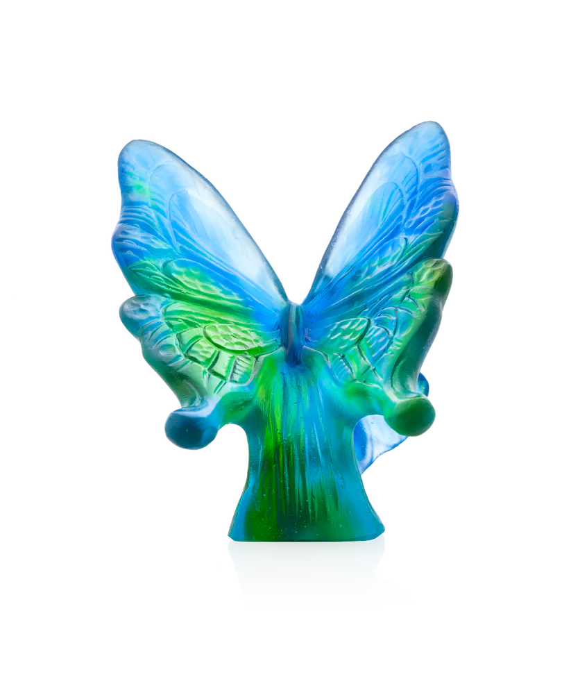 Papillon Daum, inspiré de la délicatesse d’un papillon en plein vol, évoque un moment éphémère figé dans le temps. Façonnée en pâte de verre, technique séculaire maîtrisée par Daum, la pièce se distingue par ses nuances de bleu et de vert, capturant les reflets changeants de la lumière naturelle. Les détails fins et la texture vivante de l’œuvre témoignent de la maîtrise artisanale de Daum. En plus de sa présence magnétique, cette sculpture apporte une touche d’élégance et de beauté à votre espace, invitant à la contemplation et au rêve. Création unique de la prestigieuse cristallerie Daum.