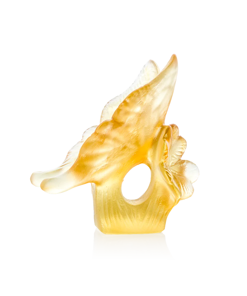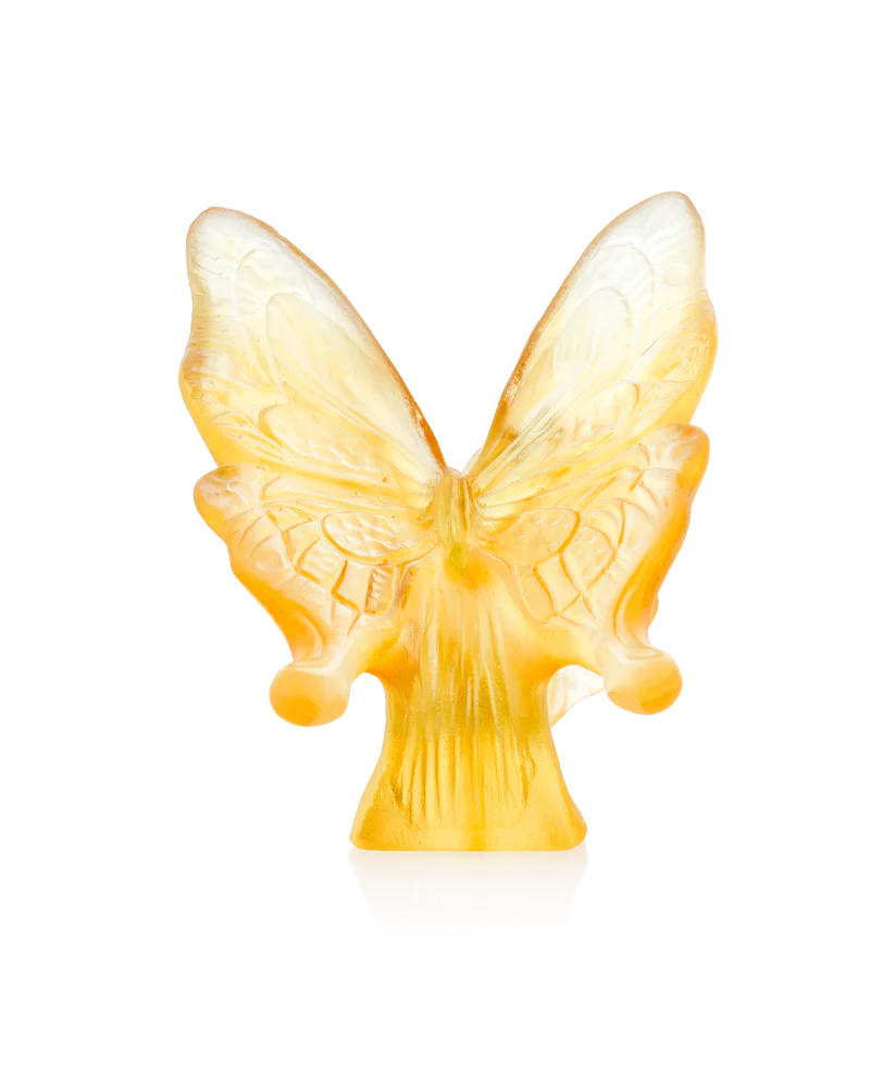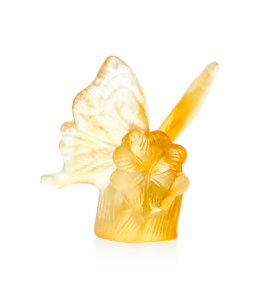 Ce Papillon Daum Jaune & Ambre, inspiré par l’élégance frivole des papillons dansant au gré des jardins ensoleillés, est un éloge à la nature. Façonnée en pâte de verre, technique séculaire maîtrisée par Daum, cette sculpture délicate capture l’éclat de lumière et la richesse des tons ambre. Les ailes déployées, figées dans un mouvement éternel, révèlent des transparences colorées et une expression saisissante. Ce papillon, symbole de transformation et de renaissance, apporte une touche de poésie et de lumière naturelle à votre espace. Il invite à une contemplation apaisante, au raffinement et à l’émerveillement. Création unique de la prestigieuse cristallerie Daum.