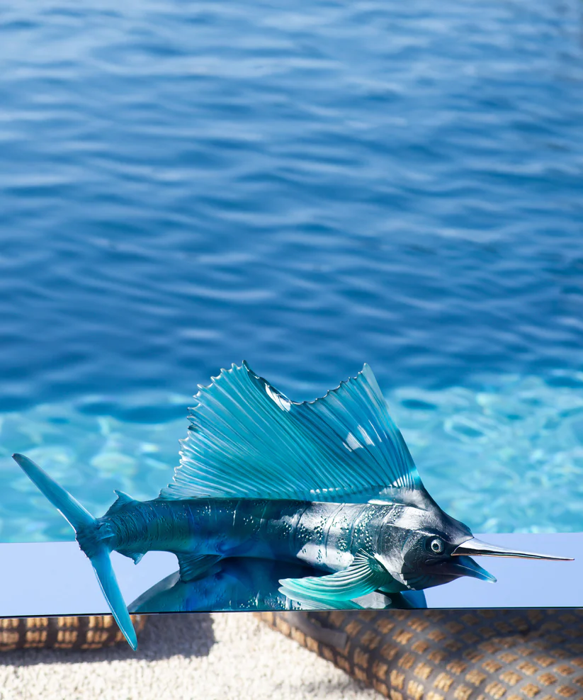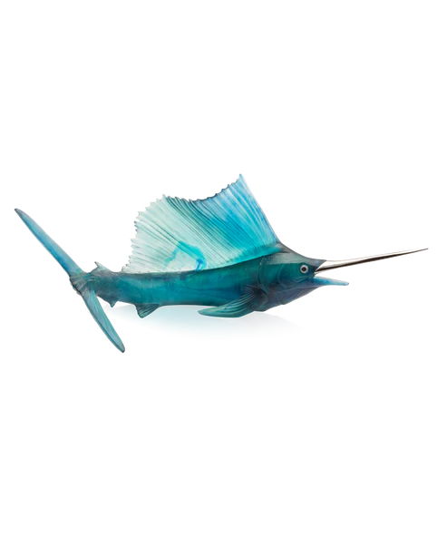 • Espadon Empereur Daum en pâte de verre, collection Maya. Rostre en palladium et yeux en topazes bleues & saphirs blancs. Édition limitée à 50 exemplaires.