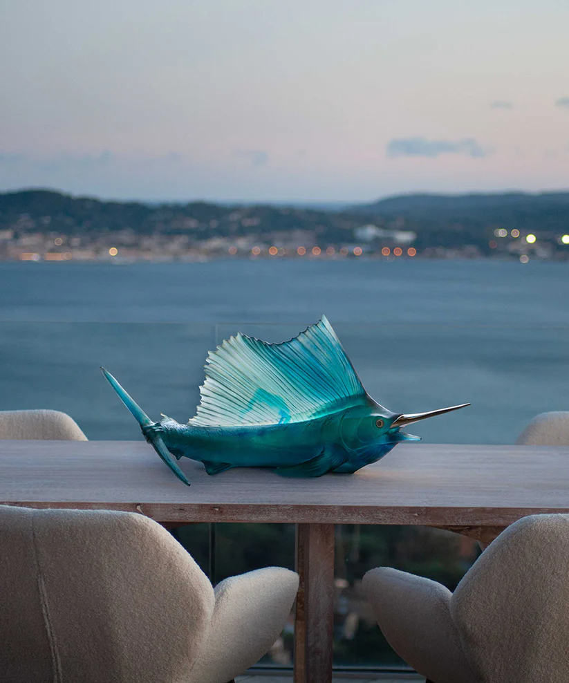 Cet Espadon Empereur Daum, issu de la collection Maya, évoque la puissance du monde sauvage. Façonné en pâte de verre, technique séculaire maîtrisée par Daum, il révèle l’élégance naturelle et la lumière qui caresse la matière. Ses jeux de lumière et de transparence subliment la grâce sculptée dans la pâte de verre, créant une aura fascinante. Chaque détail témoigne d’un savoir-faire d’exception et d’une passion pour la création. Une œuvre poétique et intemporelle, où l’art et la nature s’unissent. Signature de la prestigieuse cristallerie Daum depuis 1878. Édition limitée à 50 exemplaires.