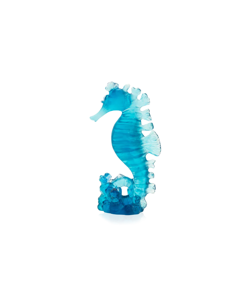 Ce hippocampe bleu Daum de la collection Maya, inspiré par la beauté mystérieuse du monde sous-marin, évoque les profondeurs de l’océan et ses créatures fascinantes. Façonné en pâte de verre, technique séculaire maîtrisée par Daum, il capture la lumière et la filtre à travers des transparences colorées, créant un spectacle visuel de nuances bleutées. Cette présence magnétique, insufflée d’un mouvement éternel, apporte une touche d’élégance et d’originalité à votre espace. Laissez-vous transporter par cette œuvre d’art, invitation à la contemplation de la nature sous un autre jour. Création unique de la prestigieuse cristallerie Daum. Édition numérotée.