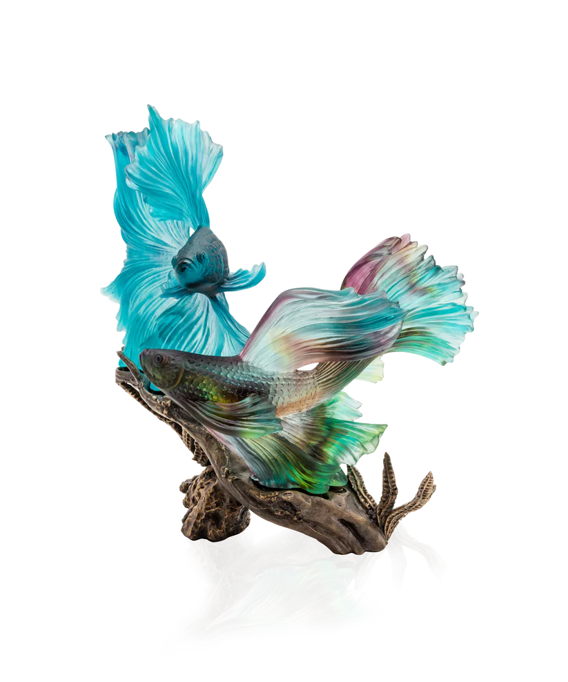 Cette sculpture Daum, évoquant la mystérieuse beauté des profondeurs marines, capture l’énergie et l’élégance des poissons combattants. Façonnée en pâte de verre, technique séculaire maîtrisée par Daum, elle révèle des nuances subtiles, mêlant transparences colorées et éclats de lumière, créant un spectacle visuel captivant. Imposante et délicate, cette œuvre d’art apporte une présence magnétique à votre espace, invitée à la contemplation, elle illumine la pièce de sa grâce maritime. Création unique de la prestigieuse cristallerie Daum. Édition limitée à 99 exemplaires.