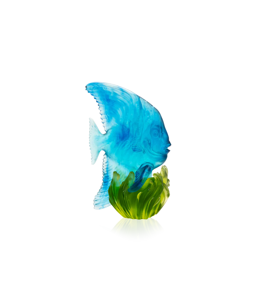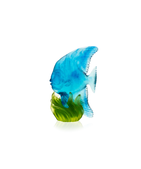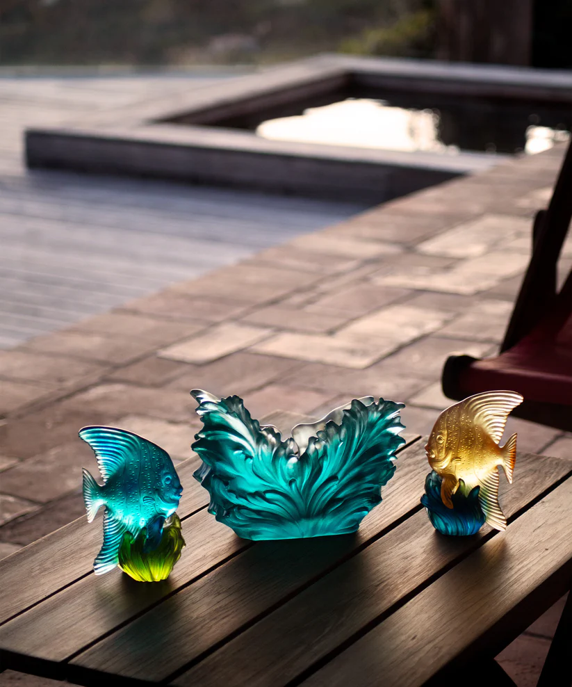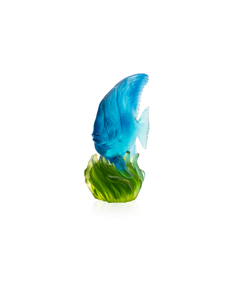 Ce poisson platax Daum de la collection Maya, inspiré des profondeurs océaniques, évoque le mystère et la majesté du monde marin. Façonnée en pâte de verre, technique séculaire maîtrisée par Daum, chaque pièce donne vie à la matière. Les nuances bleu-vert du cristal captent les éclats de lumière, créant un spectacle visuel éblouissant et toujours changeant. Cette sculpture imposante apporte une présence marine à votre espace, invitant à la contemplation de la beauté naturelle sublimée par le savoir-faire artisanal de la prestigieuse cristallerie Daum. Édition numérotée.