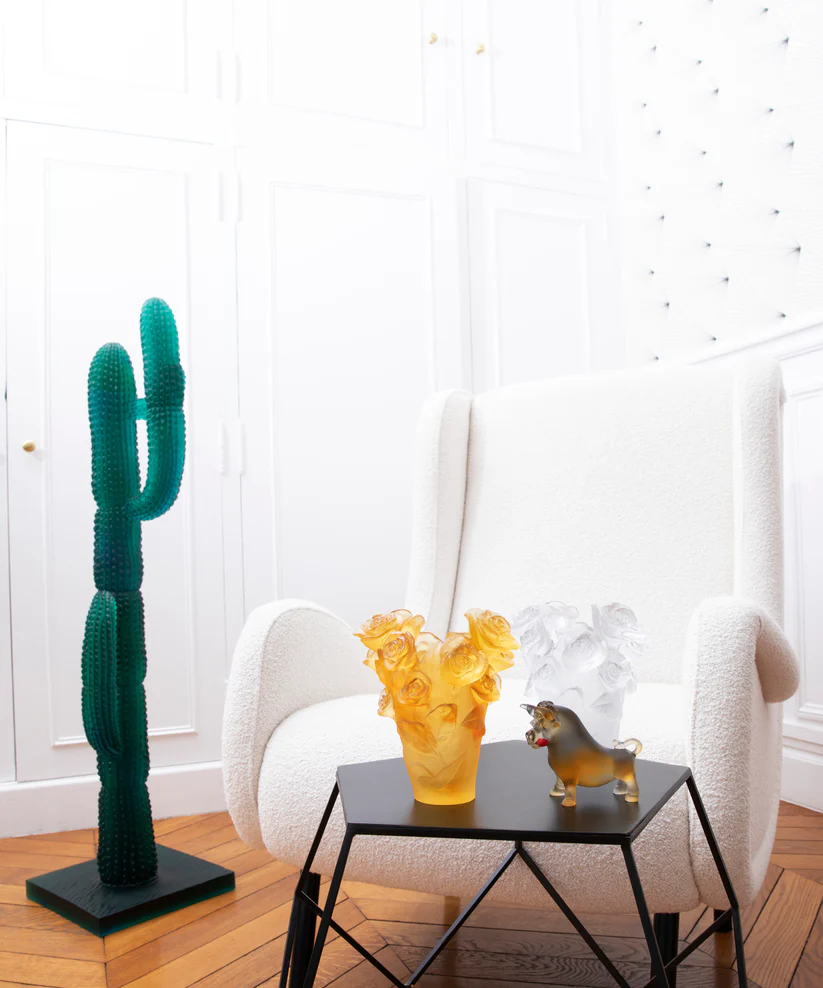 Ce buffle Daum, inspiré de l’horoscope chinois, évoque la force tranquille de la nature. Façonné à la main en pâte de verre, technique séculaire maîtrisée par Daum, son corps robuste se pare de transparences colorées, capturant les éclats de lumière. Sa présence magnétique, presque hypnotique, transforme l’espace environnant. Chaque détail de cette œuvre d’art, de ses cornes imposantes à son regard pénétrant, est le fruit d’une maîtrise artisanale inégalée. Offrez-vous un moment de contemplation devant cette expression de l’art verrier à son apogée. Création unique de la prestigieuse cristallerie Daum.