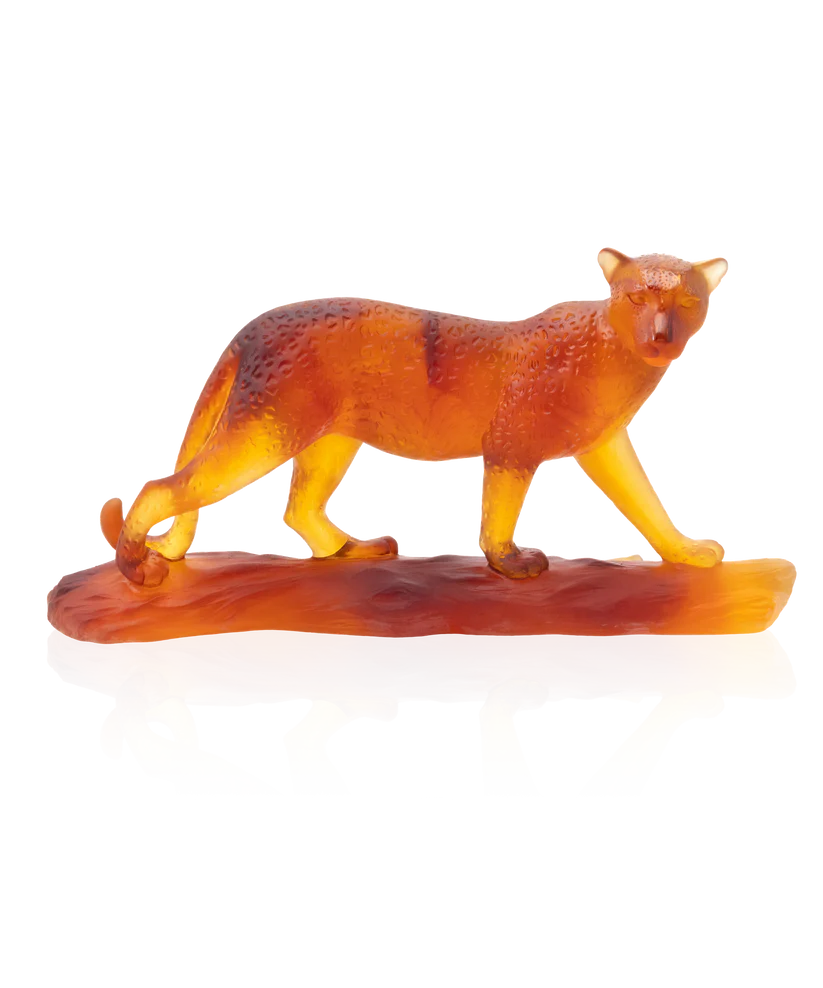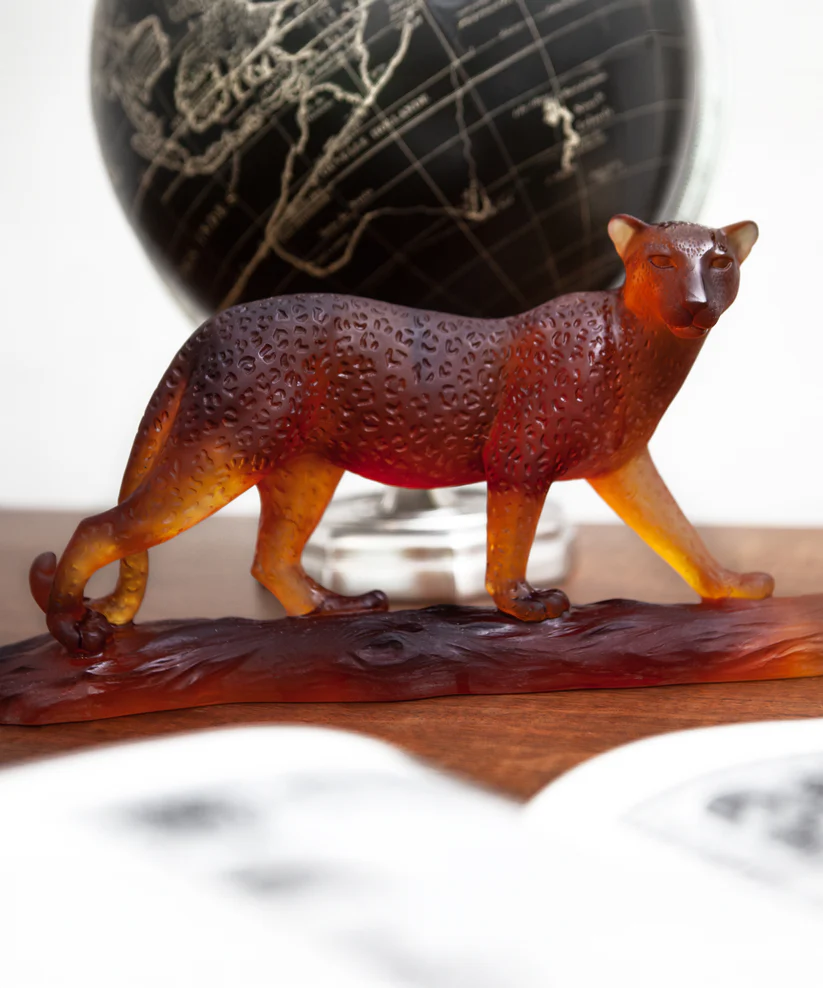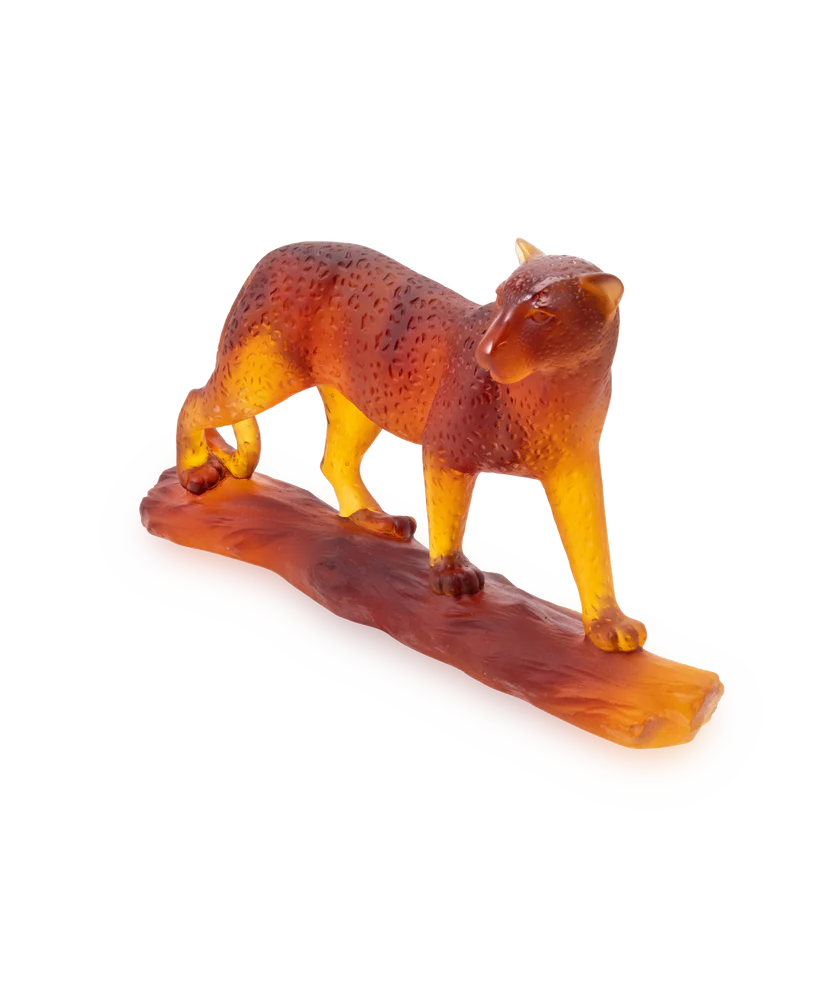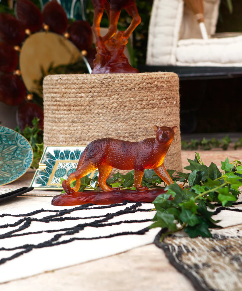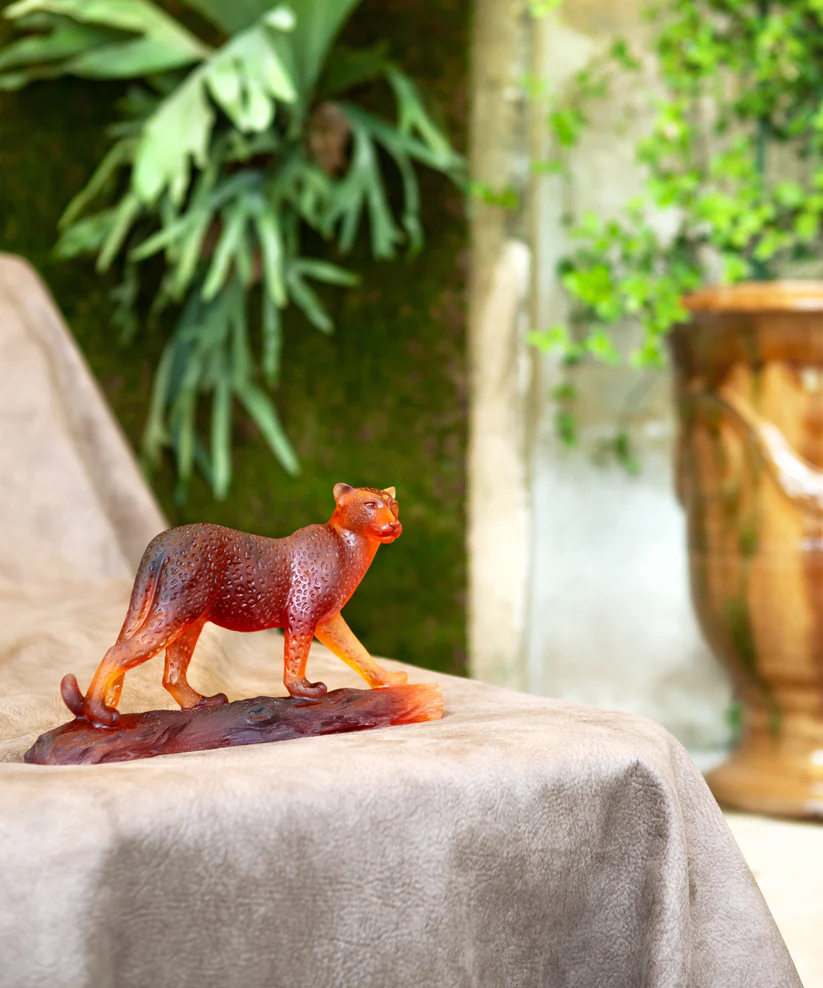 Cette sculpture Léopard Tropical Daum, limitée à 500 exemplaires dans le monde et inspirée par la majestuosité incomparable du léopard des tropiques, évoque l’agilité et l’élégance de l’animal dans son environnement naturel. Façonnée avec soin en pâte de verre, technique séculaire maîtrisée par Daum, elle capture l’éclat vivant du cristal, lui donnant une présence magnétique. Les coloris non précisés de la sculpture évoquent les nuances variées de l’écosystème tropical, ajoutant à son charme. Cette sculpture Daum, imposante et élancée, invite à la contemplation de la beauté sauvage, éternellement figée dans un mouvement gracieux. Création unique de la prestigieuse cristallerie Daum. Édition limitée à 500 exemplaires.
